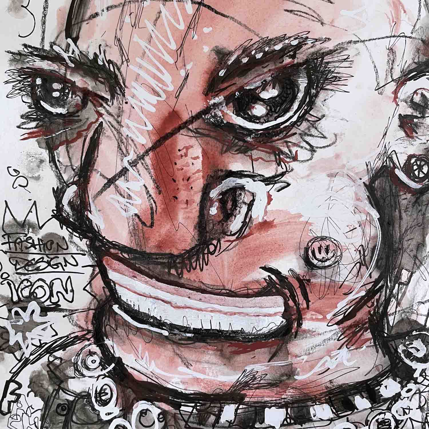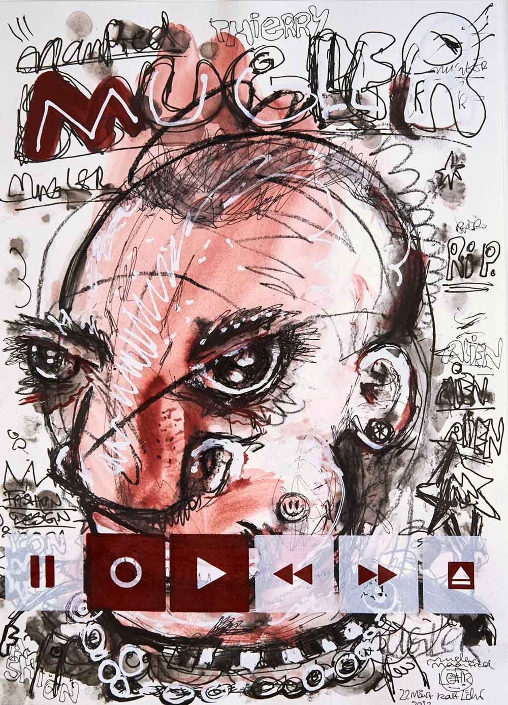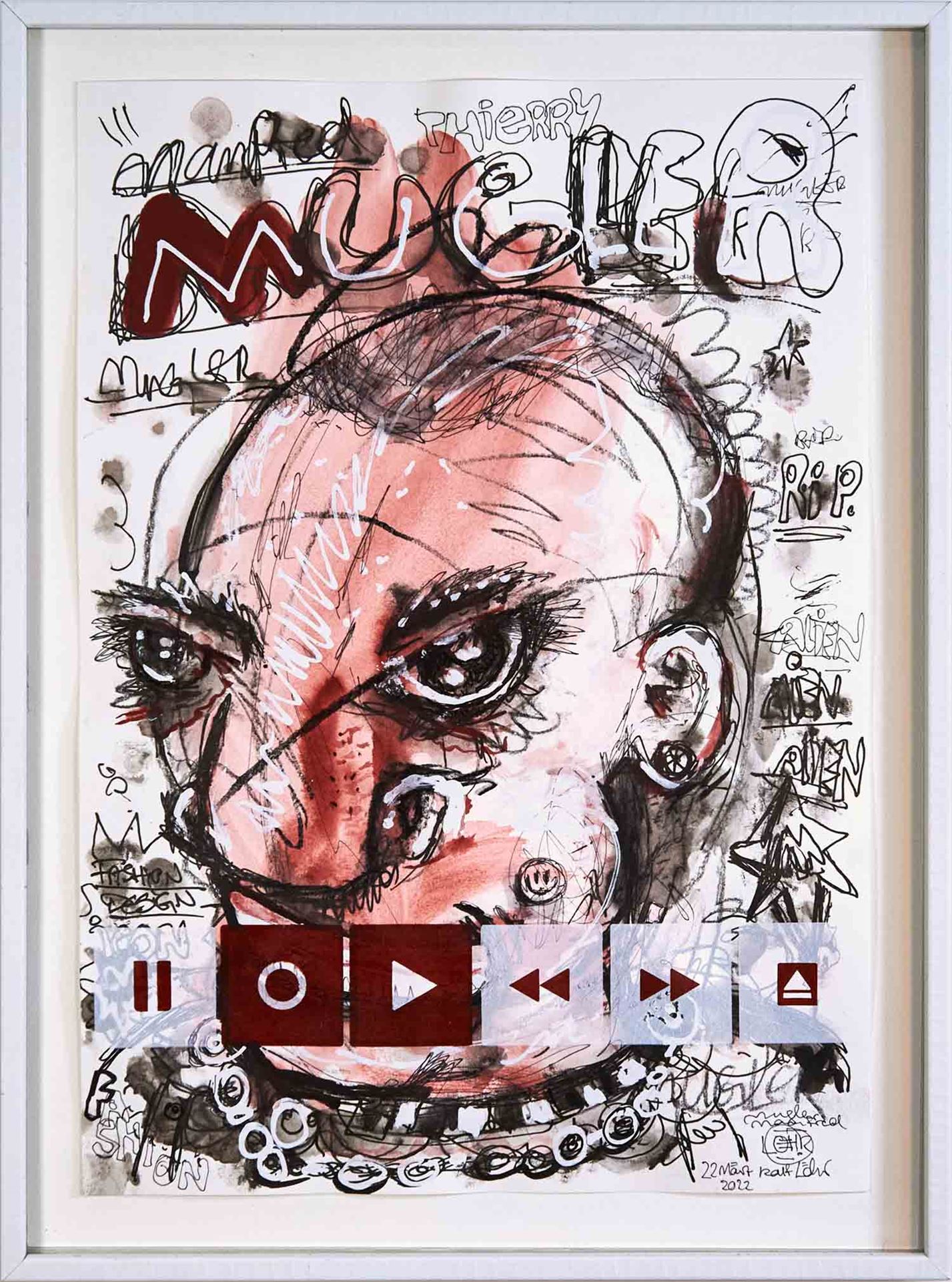 Das Kunstwerk "Manfred Thierry Mugler"wurde in Kreide, Kohle, Fineliner und Tusche auf Hahnemühle Papier gemalt. Veredelt wurde das Werk durch 2 farbigen Siebdruck in weiß/rot . Das Außenmaß dieses Unikates beträgt 25 cm x 34 cm. Die Zeichnung wird gerahmt mit Museumsglas angeboten.