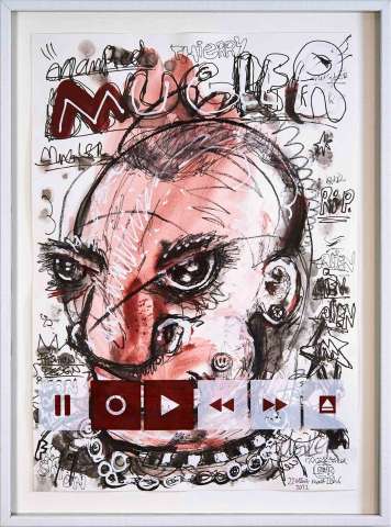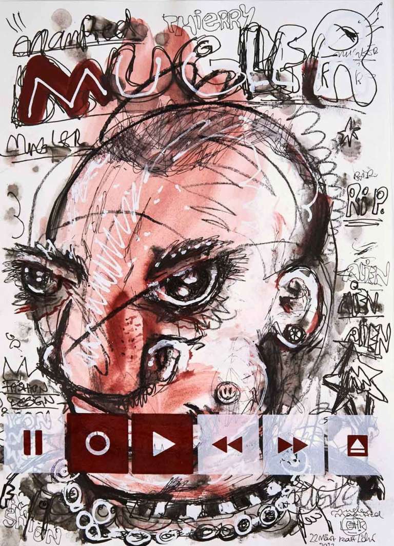 Kaufen Sie jetzt Malerei online bei CRELALA KUNST. "Manfred Thierry Mugler" ein modernes Mixed-Media Bild aus der 16tlg. Serie Record & Play von Ralf Löhr.