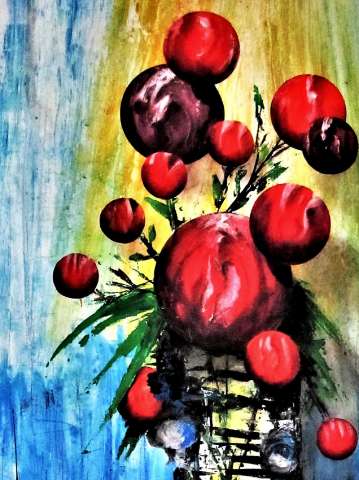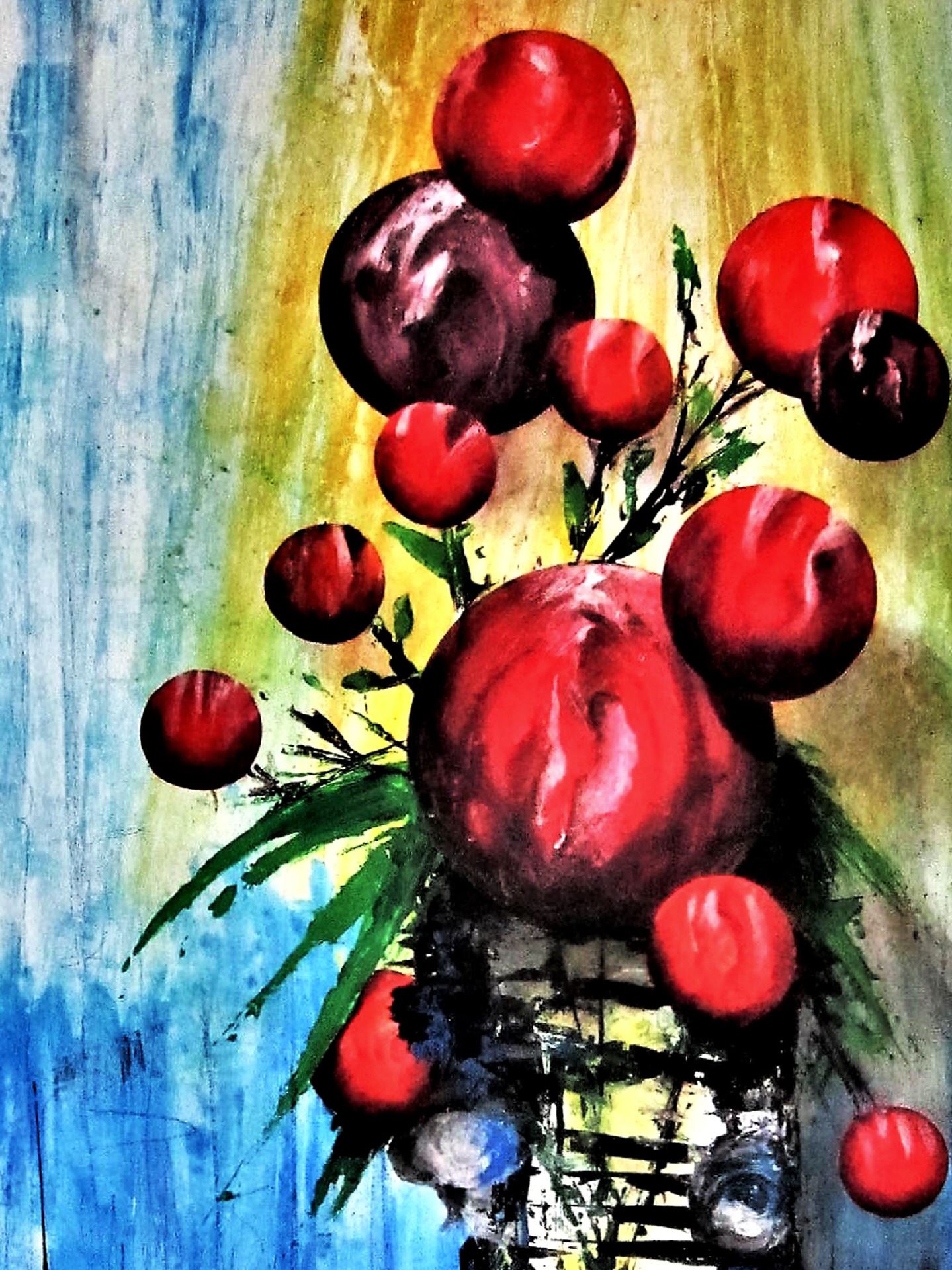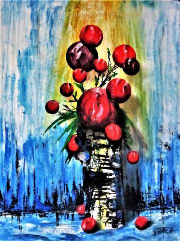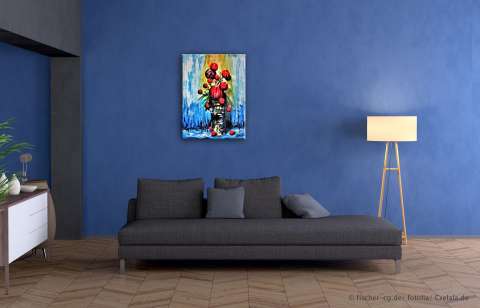 Das Kunstwerk "Stillleben" wurde in Acryl auf Leinwand gemalt. Das Außenmaß dieses Unikates beträgt 80 cm x 60 cm x 2 cm.