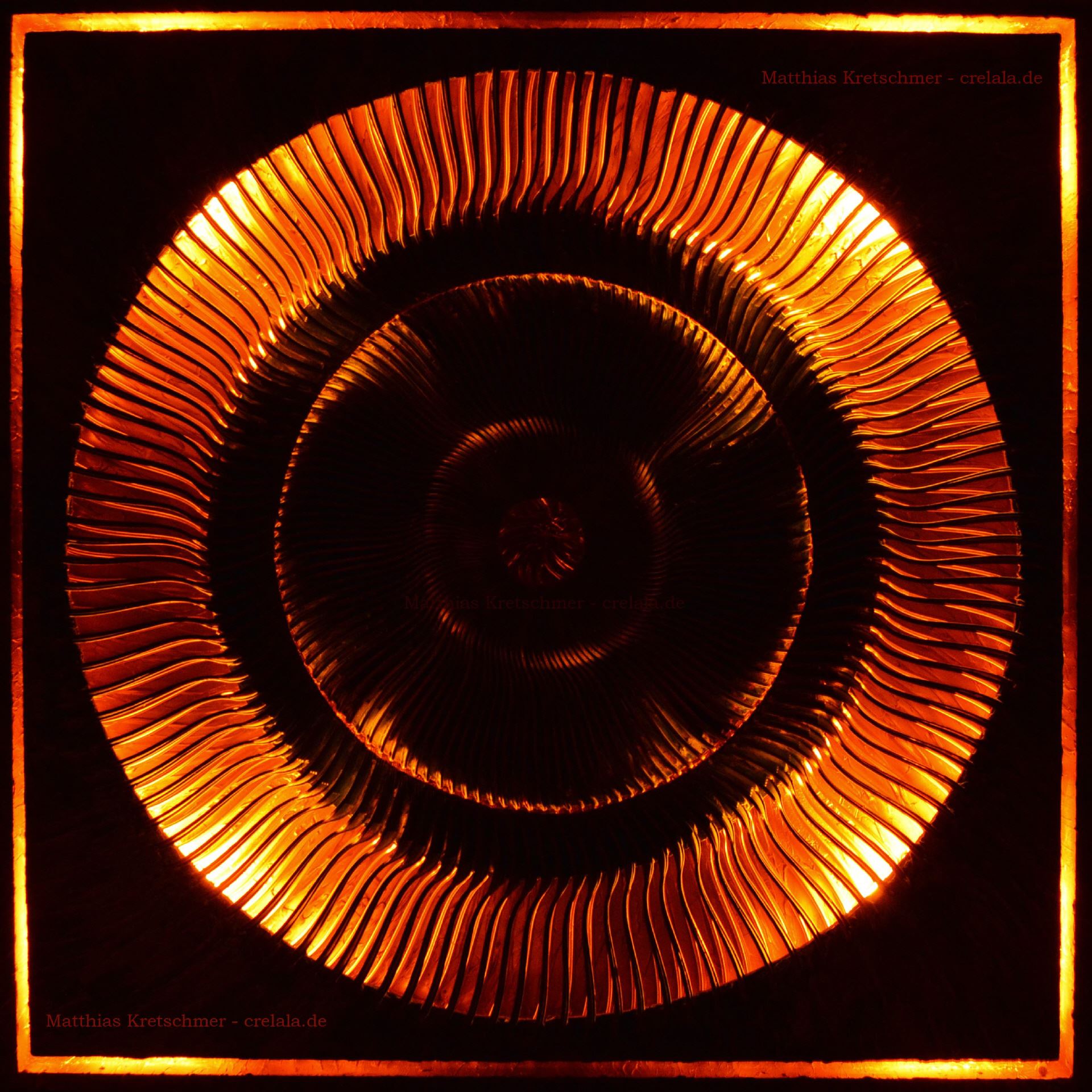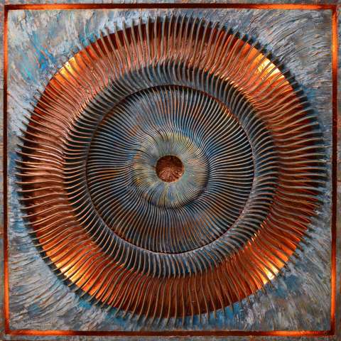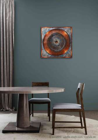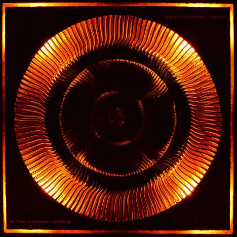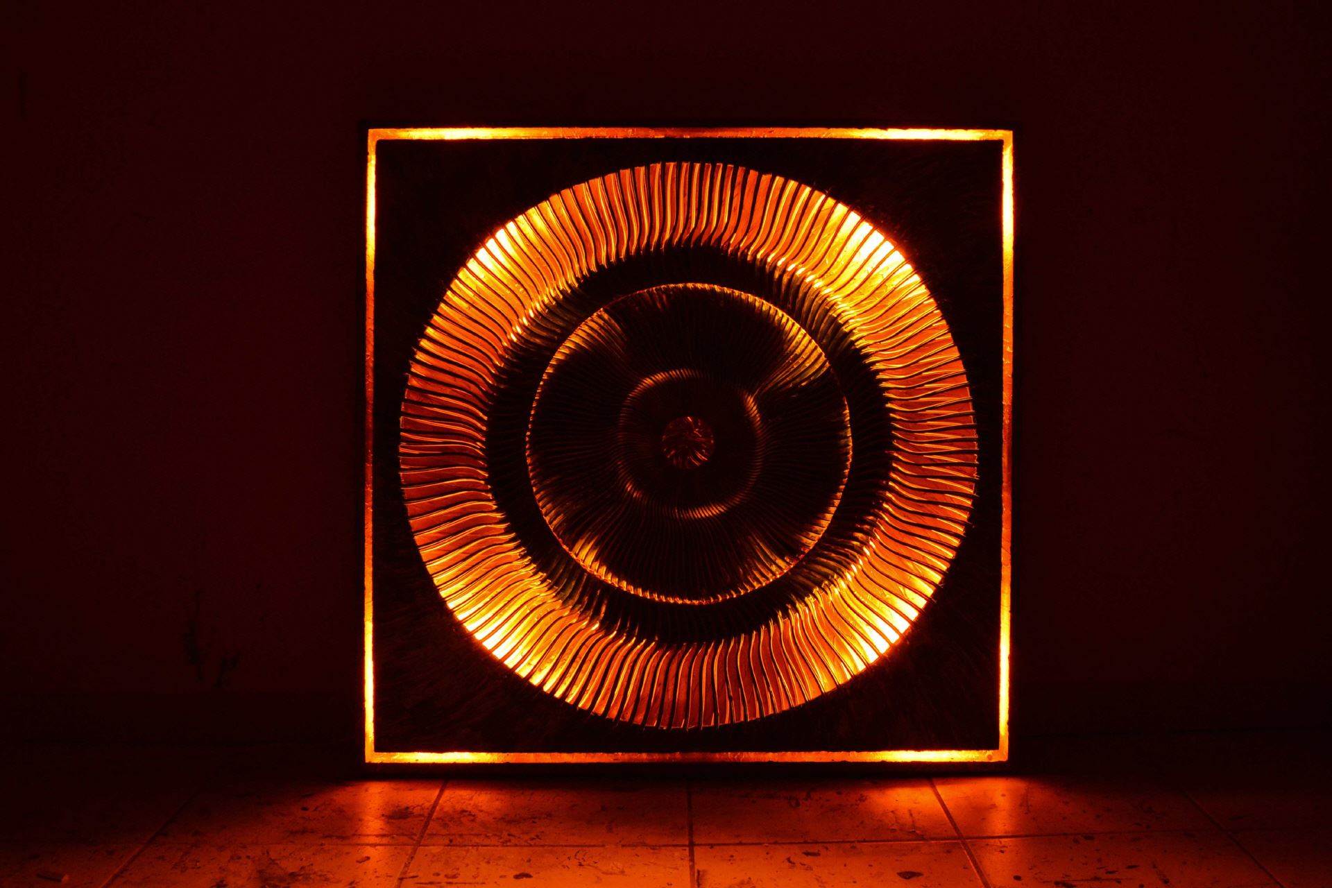 Das Kunstwerk "Burning Copper" ist eine Assemblage bestehend aus Acryl, Spachtelmasse, Farbspray, Kupferfarbe, Kupferoxid, -pulver und -spray und -pulver, Gabeln, Styropor, Stromkreis mit 4 LED-Glühbirnen auf Leinwand . Das Kunstwerk ist gerahmt und mit einer integrierten LED-Lichterkette versehen. Die Farben der Lichterkette lassen sich individuell als Standlicht oder aber auch im Wechsel einstellen. Das Außenmaß dieses Unikates beträgt 70 cm x 70 cm.