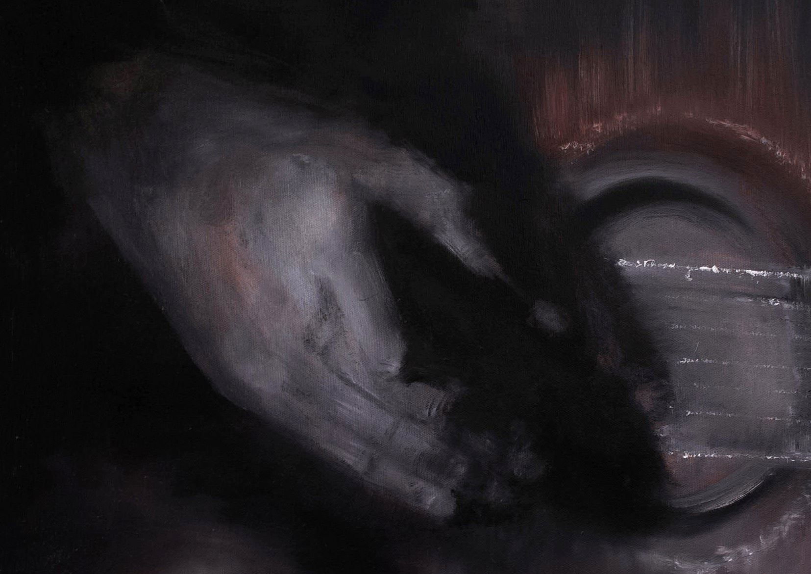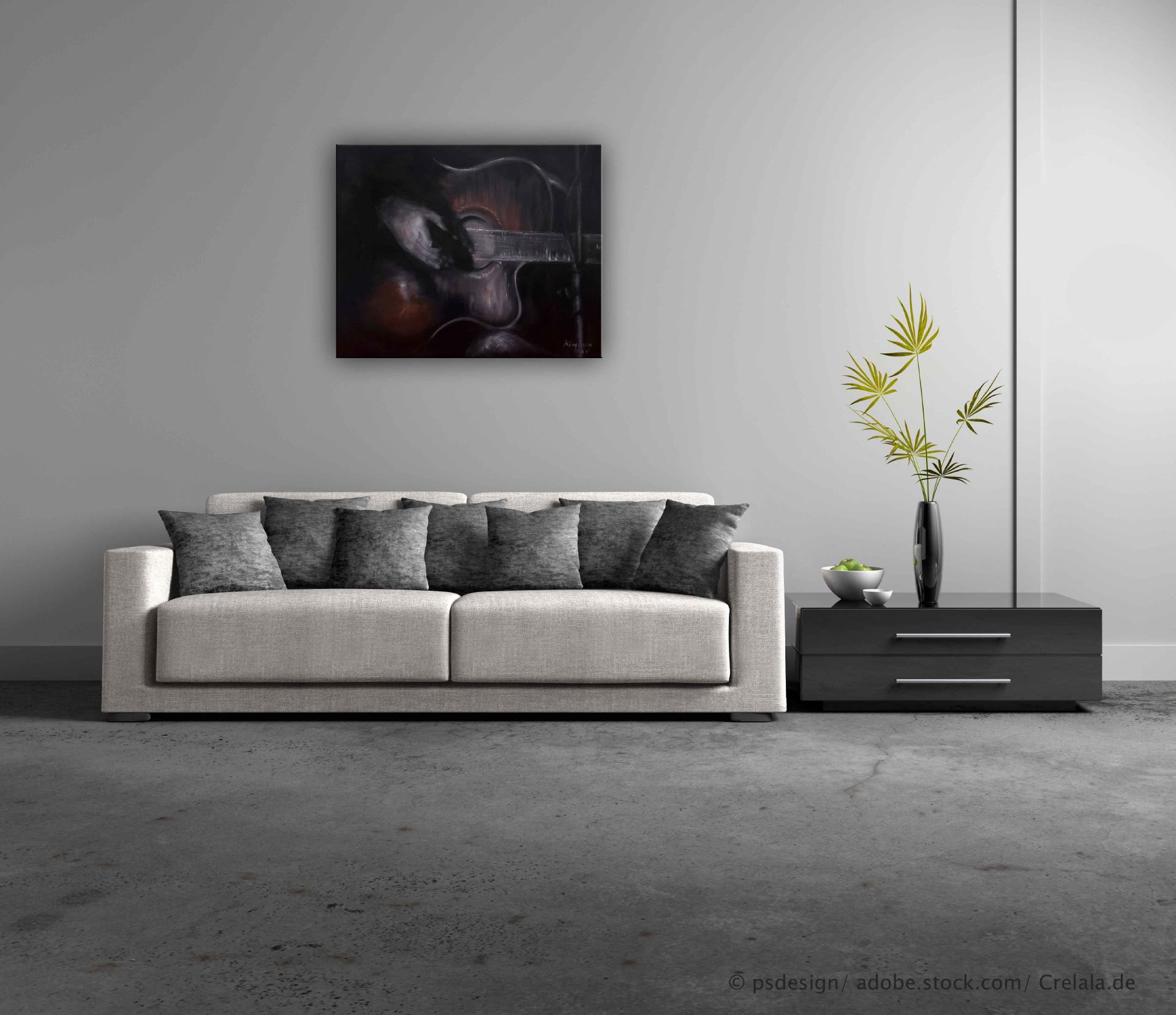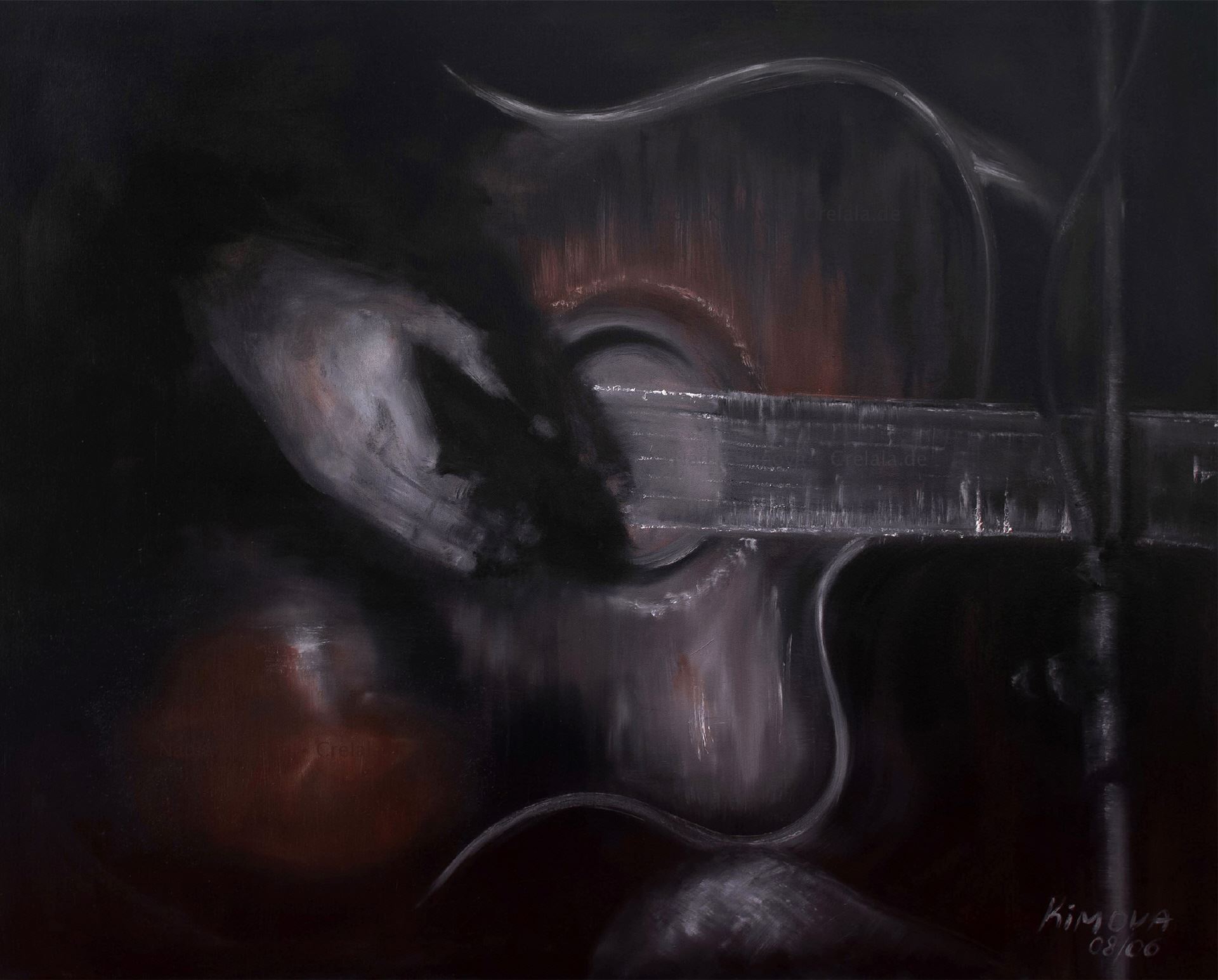 Das Kunstwerk "Sleepless Guitar" wurde in Mischtechnik auf Leinwand gemalt. Das Außenmaß dieses Unikates beträgt 80 cm x 100 cm x 1,7 cm.