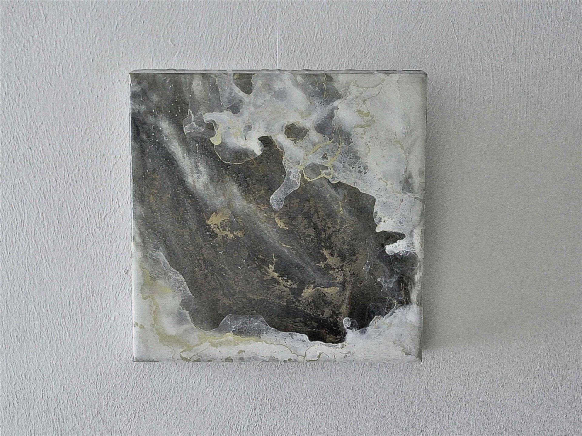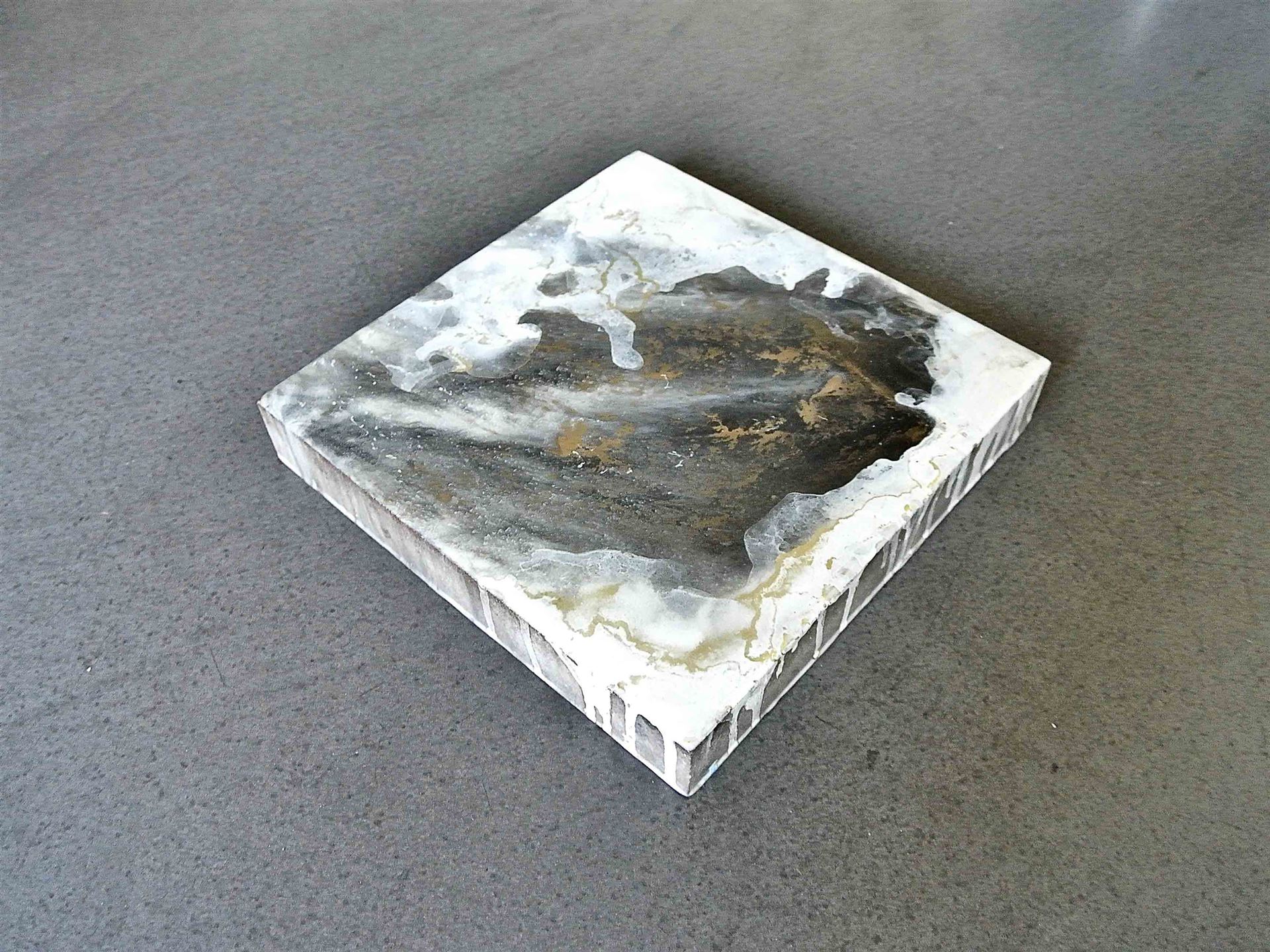 Das Kunstwerk "O.T.5" wurde mit Resin , Alkoholtinte und Mixed Media auf Holzmalgrund gemalt. Das Außenmaß dieses Unikates beträgt 20 cm x 20 cm x 3 cm.
