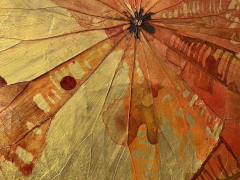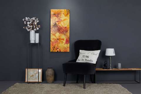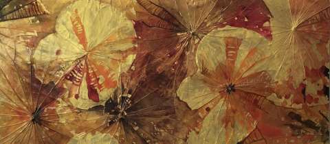 Das Kunstwerk "Goldene Stunde II" wurde mit spezieller thailändischer Lotusmalerei erstellt. Das Kunstwerk ist mit Acrylfarbe, Antiktusche und Mixed Media auf einem Lotusblatt auf Leinwand gemalt. Die Ränder der Leinwand sind schwarz gehalten. Das Kunstwerk kann sowohl hochkant als auch quer gehängt werden. Das Außenmaß dieses Unikates beträgt 90 cm x 40 cm x 4 cm.