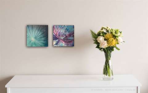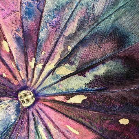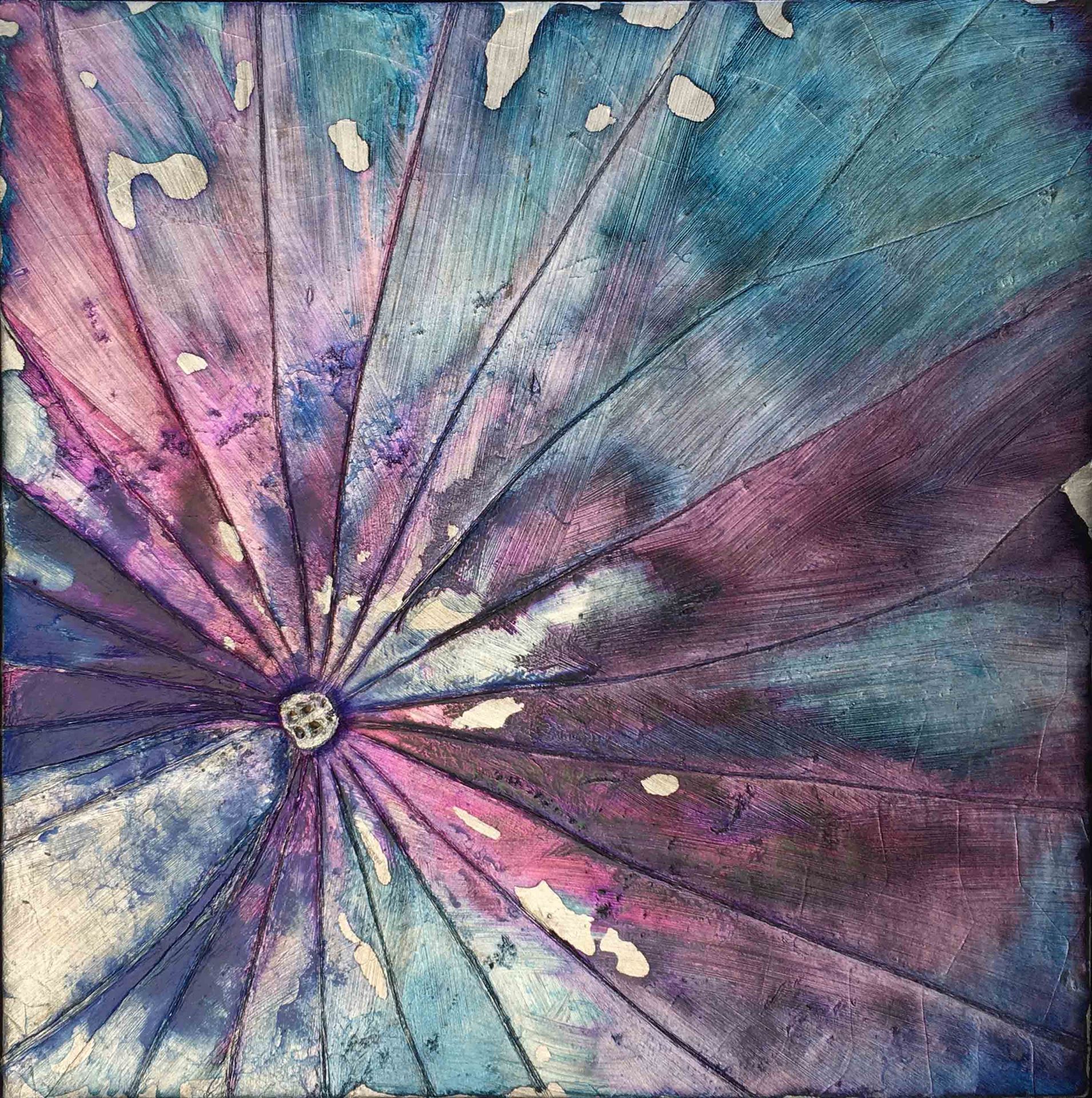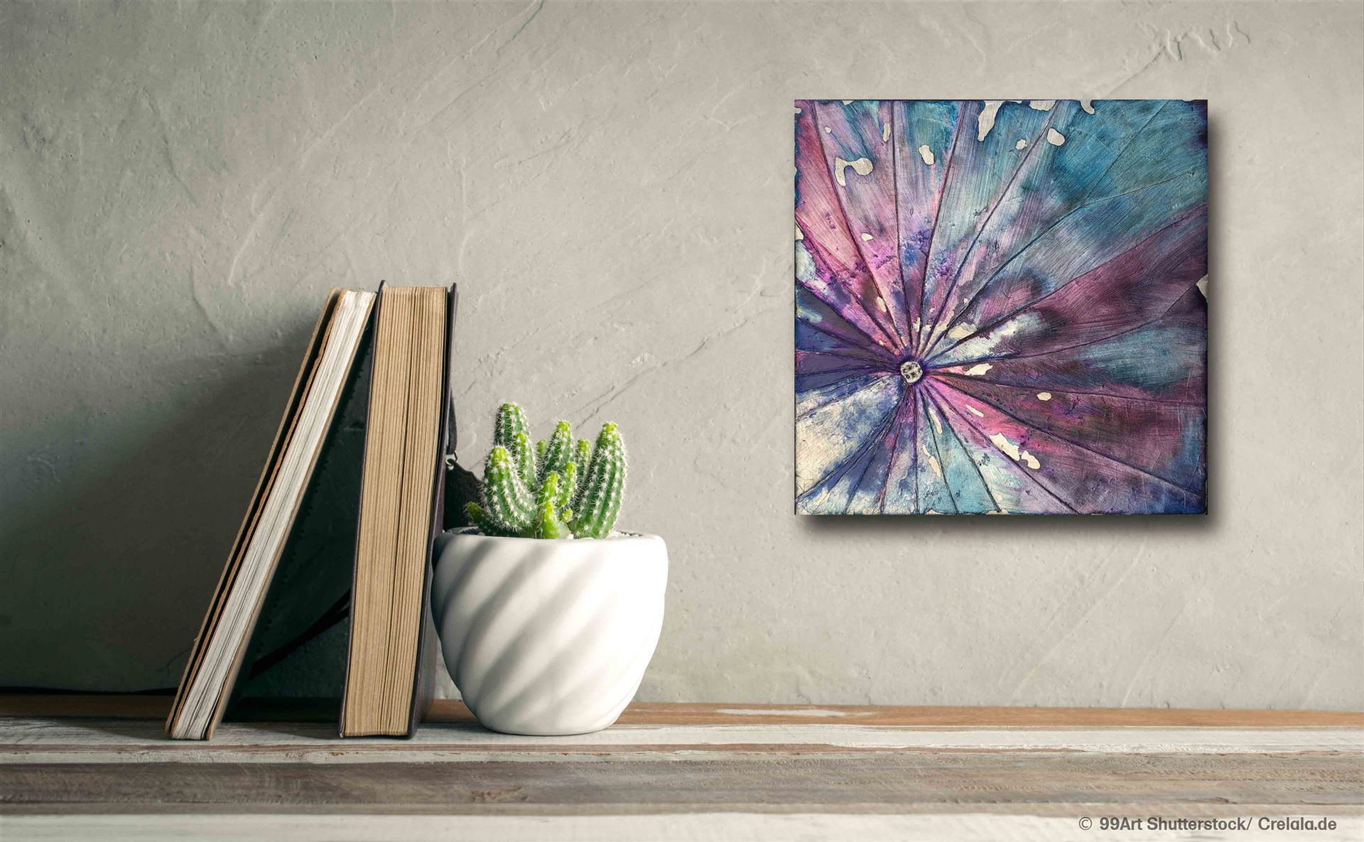 Das Kunstwerk "Loslassen" wurde mit spezieller thailändischer Lotusmalerei erstellt. Das Kunstwerk ist in Acryl, Antiktusche und Mixed Media auf einem Lotusblatt auf Leinwand gemalt. Die Ränder der Leinwand sind bemalt. Das Außenmaß dieses Unikates beträgt 20 cm x 20 cm x 4 cm. Die Bilder lassen sich wunderbar mit anderen Werken kombinieren.