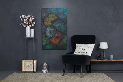 Das Kunstwerk "Understatement" wurde mit spezieller thailändischer Lotusmalerei erstellt. Das Kunstwerk ist mit Ölfarbe auf einem Lotusblatt auf Leinwand gemalt. Die Ränder der Leinwand sind schwarz gehalten. Das Kunstwerk kann sowohl hochkant als auch quer gehängt werden. Das Außenmaß dieses Unikates beträgt 100 cm x 60 cm x 4 cm.
