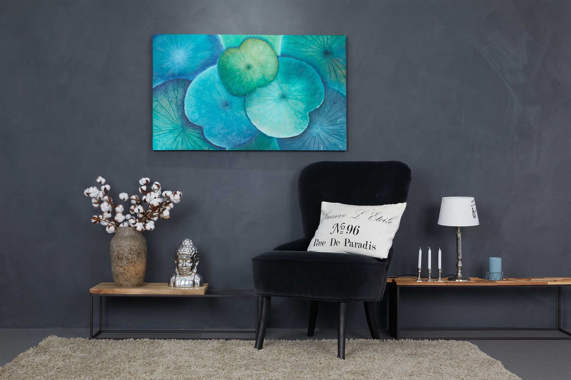 Das Kunstwerk "Wasser" wurde mit der speziellen thailändischen Lotusmalerei erstellt. Das Kunstwerk ist mit Ölfarbe auf einem Lotusblatt auf Leinwand gemalt. Die Ränder der Leinwand sind schwarz gehalten. Das Kunstwerk kann sowohl hochkant als auch quer gehängt werden. Das Außenmaß dieses Unikates beträgt 60 cm x 100 cm x 4 cm.