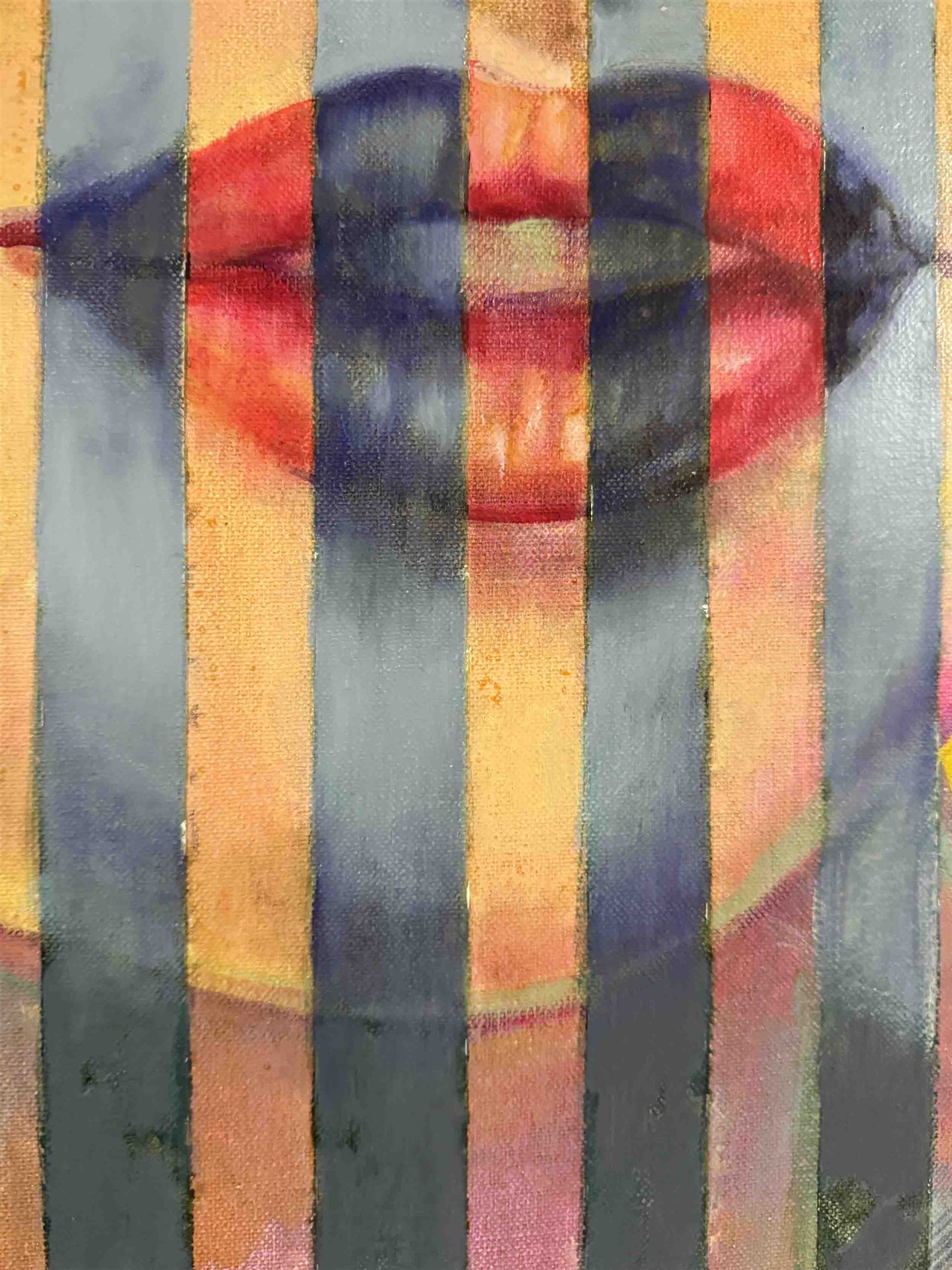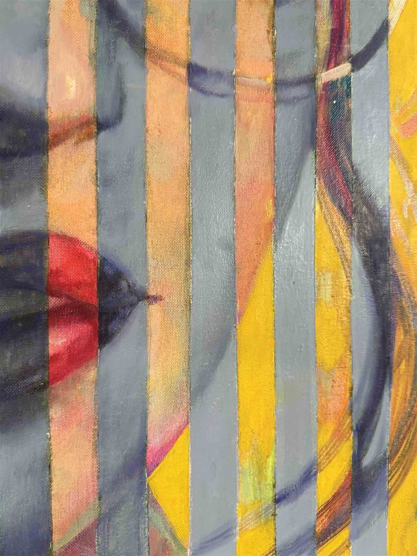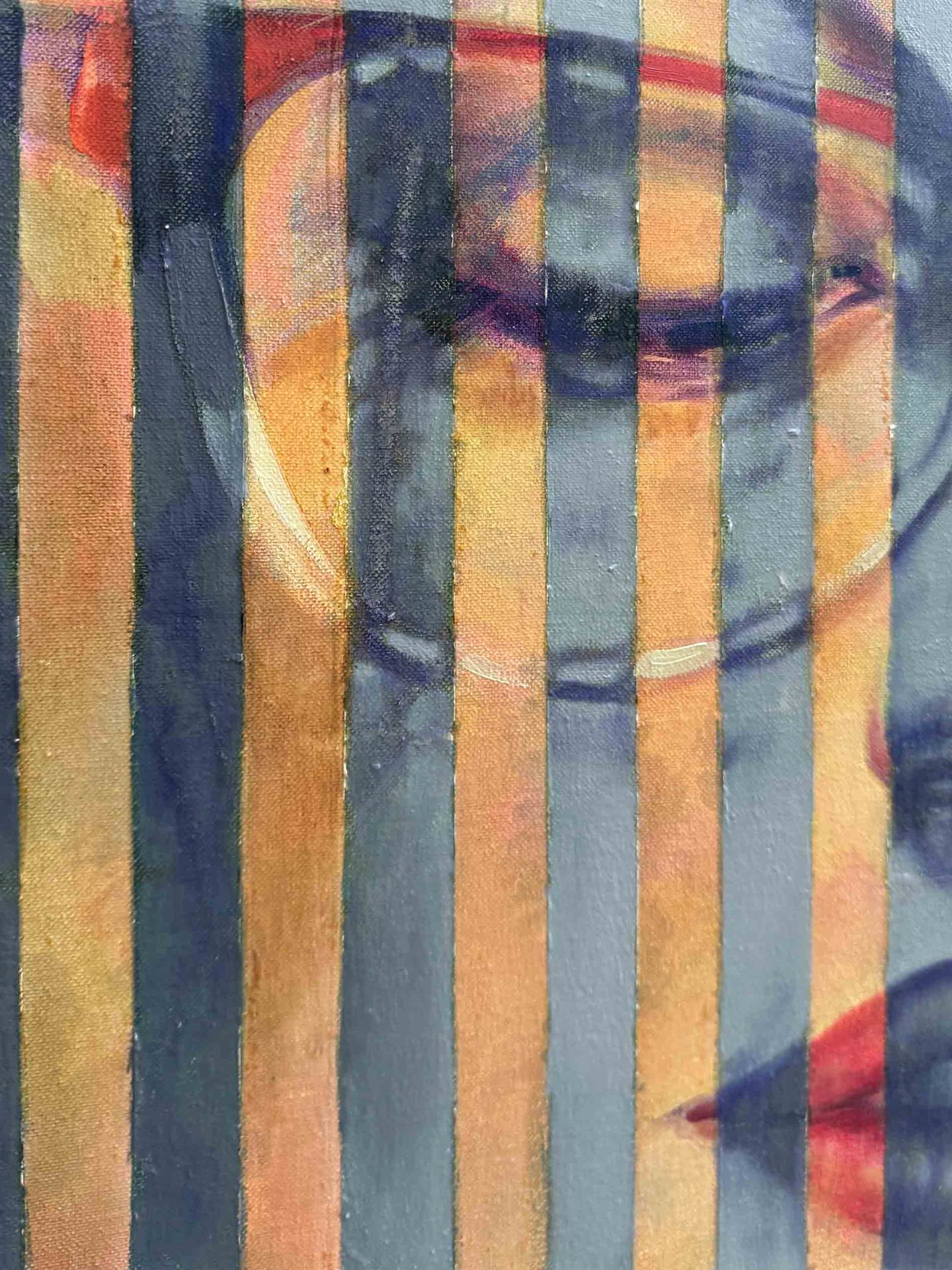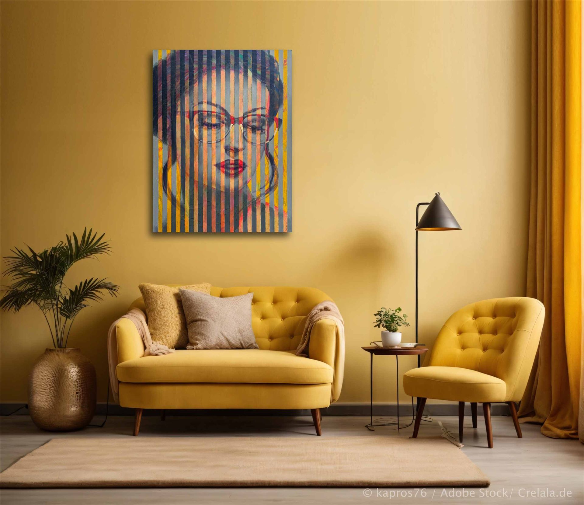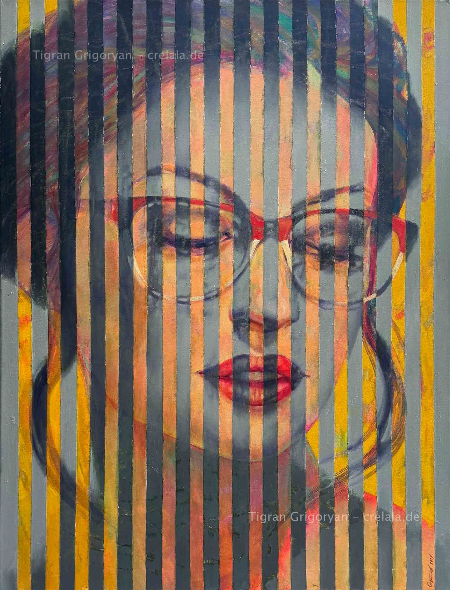 Das Kunstwerk "Portrait Brille" wurde in Öl auf Leinwand gemalt. Das Gemälde hat ein Außenmaß von 110 cm x 80 cm x 1,7 cm.