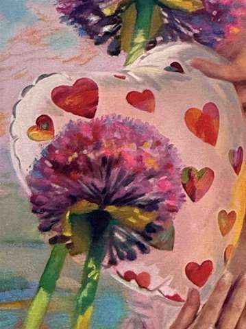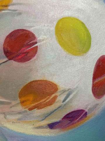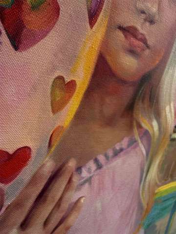 Das Kunstwerk "Die süße Melancholie" wurde in Öl auf Leinwand gemalt. Das Gemälde hat ein Außenmaß von 70 cm x 80 cm x 1,7 cm.