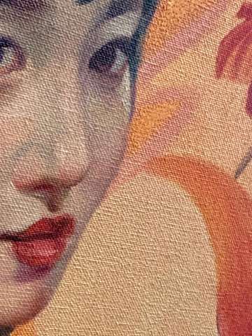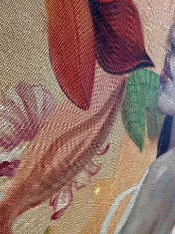 Das Kunstwerk "Verflochtene Gedanken" wurde in Öl auf Leinwand gemalt. Das Gemälde hat ein Außenmaß von 80 cm x 90 cm x 1,7 cm.