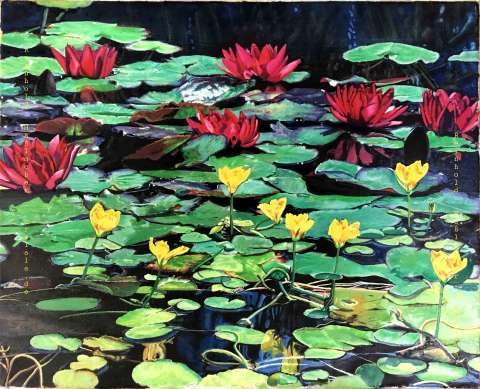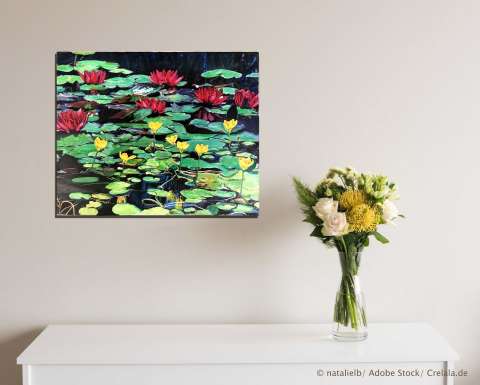 Das Kunstwerk "Seerosen" wurde in Öl auf Leinwand gemalt. Das Außenmaß dieses Unikates beträgt 40 cm x 49,5 cm x 2 cm.