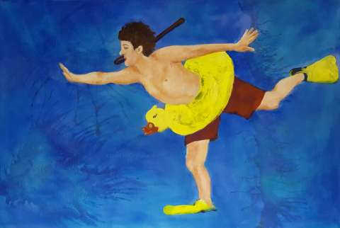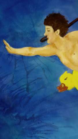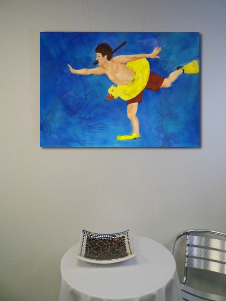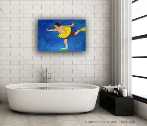 Das Kunstwerk "Freischwimmer" wurde in Acryl auf Leinwand gemalt. Das Außenmaß dieses Unikates beträgt 70 cm x 100 cm x 4 cm.