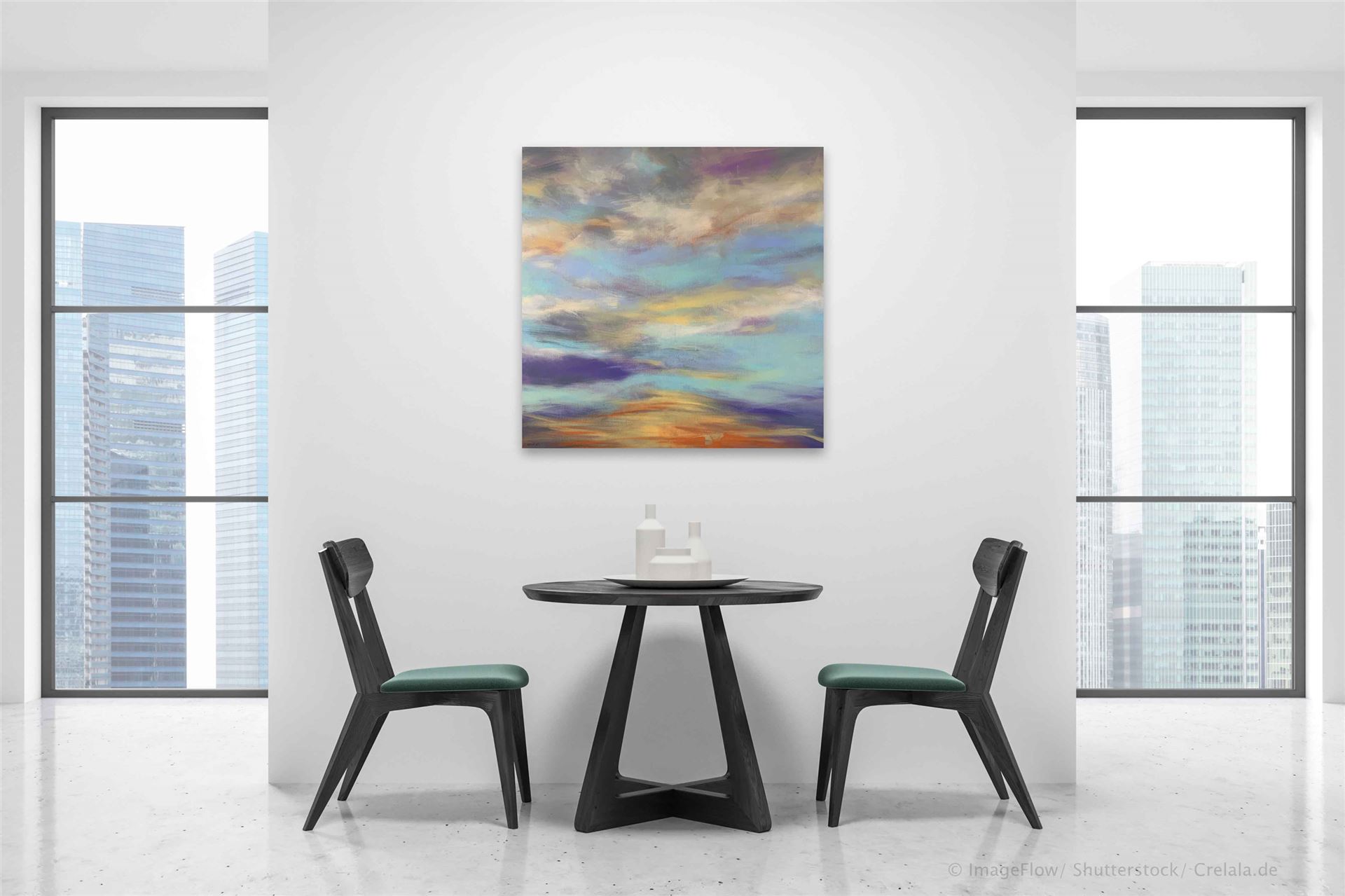 Das Kunstwerk "Heaven is a place on earth" wurde in Acryl und Mixed Media auf Leinwand gemalt. Das Außenmaß dieses Unikates beträgt 100 cm x 100 cm x 2 cm.