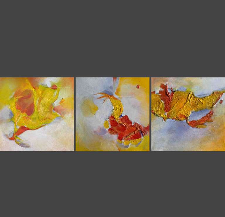 Die Kunstwerke "Kolibri, Phoenix und Drachenland" wurde in Acryl auf Leinwand gemalt. Die einzelnen Außenmaße der jeweiligen Unikate betragen einzeln jeweils 30 cm x 30 cm x 3,5 cm, das Gesamtmaß aller 3 Gemälde beträgt 90 cm x 30 cm x 3,5 cm.