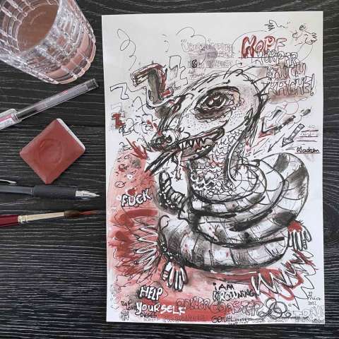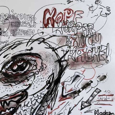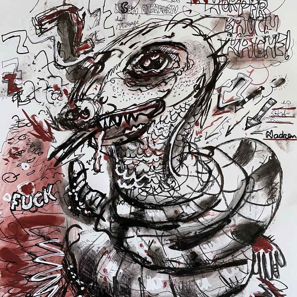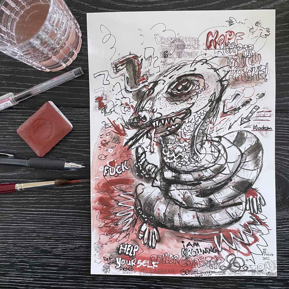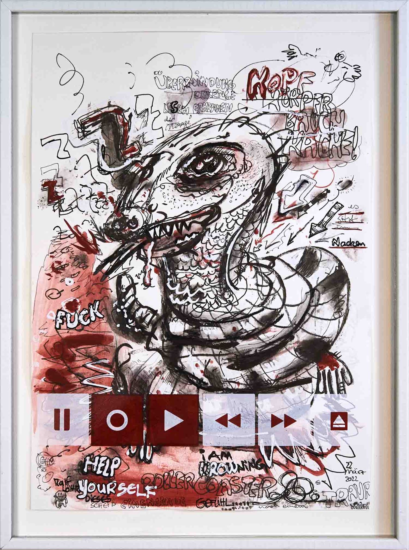 Das Kunstwerk "Die Überwindung der Enge"wurde in Kreide, Kohle, Fineliner und Tusche auf Hahnemühle Papier gemalt. Veredelt wurde das Werk durch 2 farbigen Siebdruck in weiß/rot . Das Außenmaß dieses Unikates beträgt 25 cm x 34 cm. Die Zeichnung wird gerahmt mit Museumsglas angeboten.