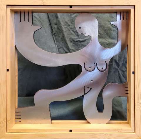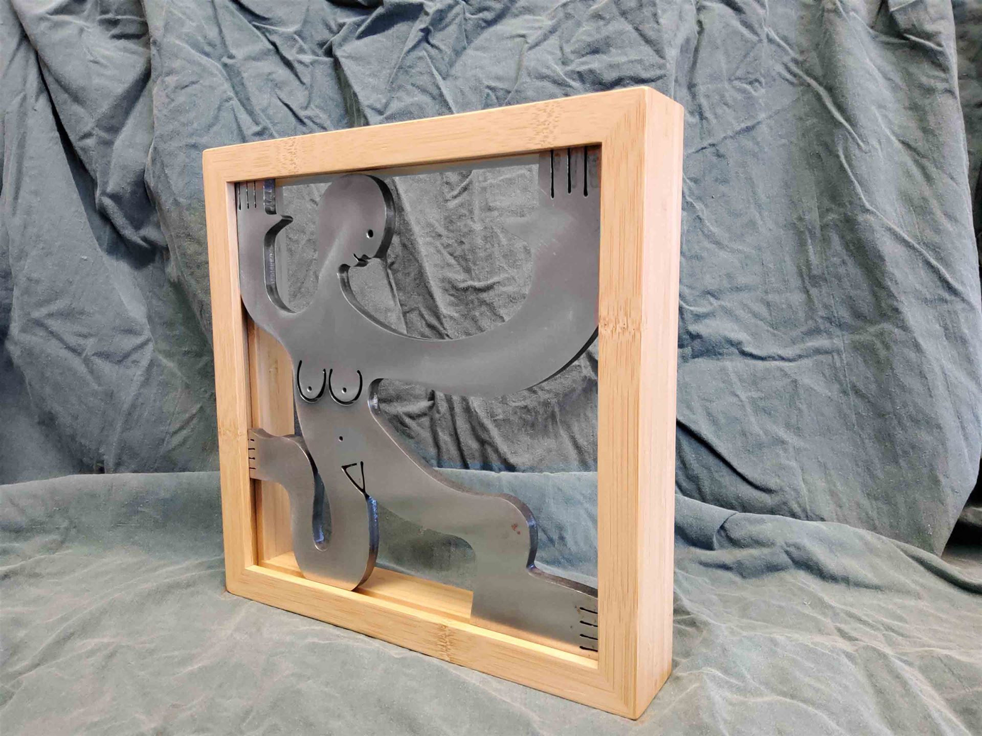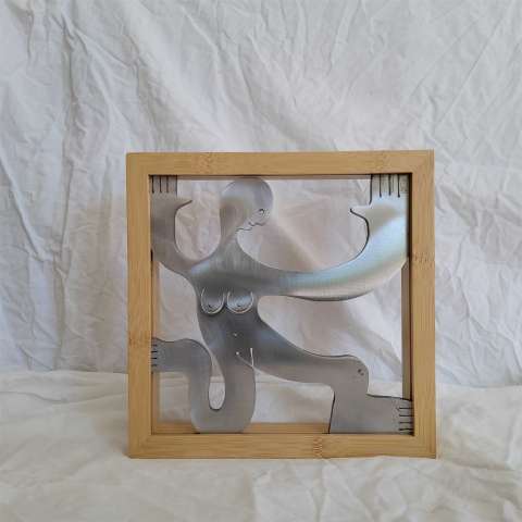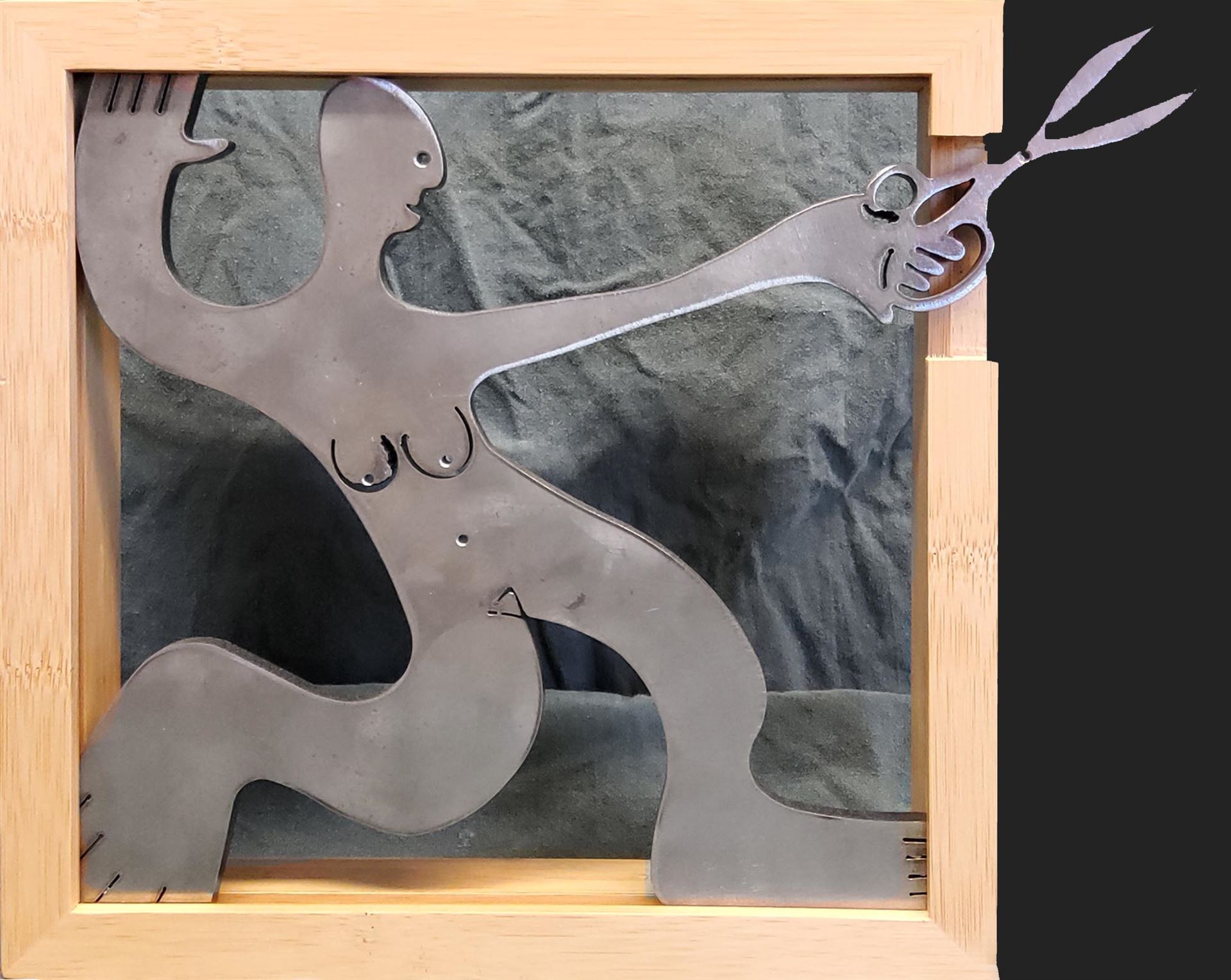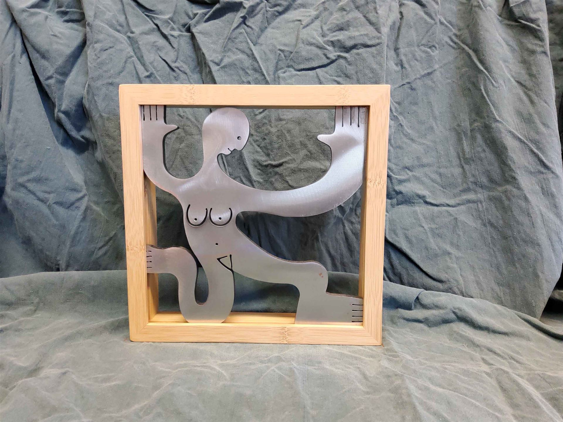 Das Kunstwerk "Weiblich Phase 1" ist ein Stahlbild aus Cortenstahl mit Bambusrahmen. Das Außenmaß dieses Kunstwerkes beträgt 25 cm x 25 cm x 4,5 cm. Das Kunstwerk wird mit Rahmen zum Verkauf angeboten. Das Stahlbild hat eine limitierte Gesamtauflage von 11 Stück.