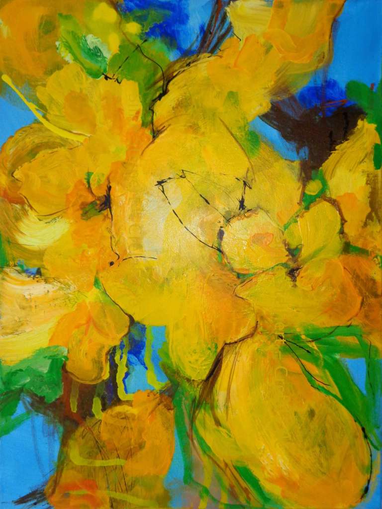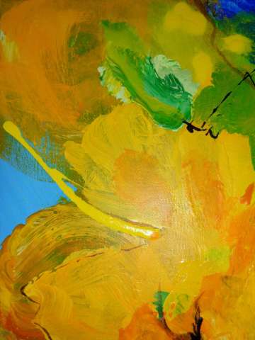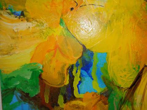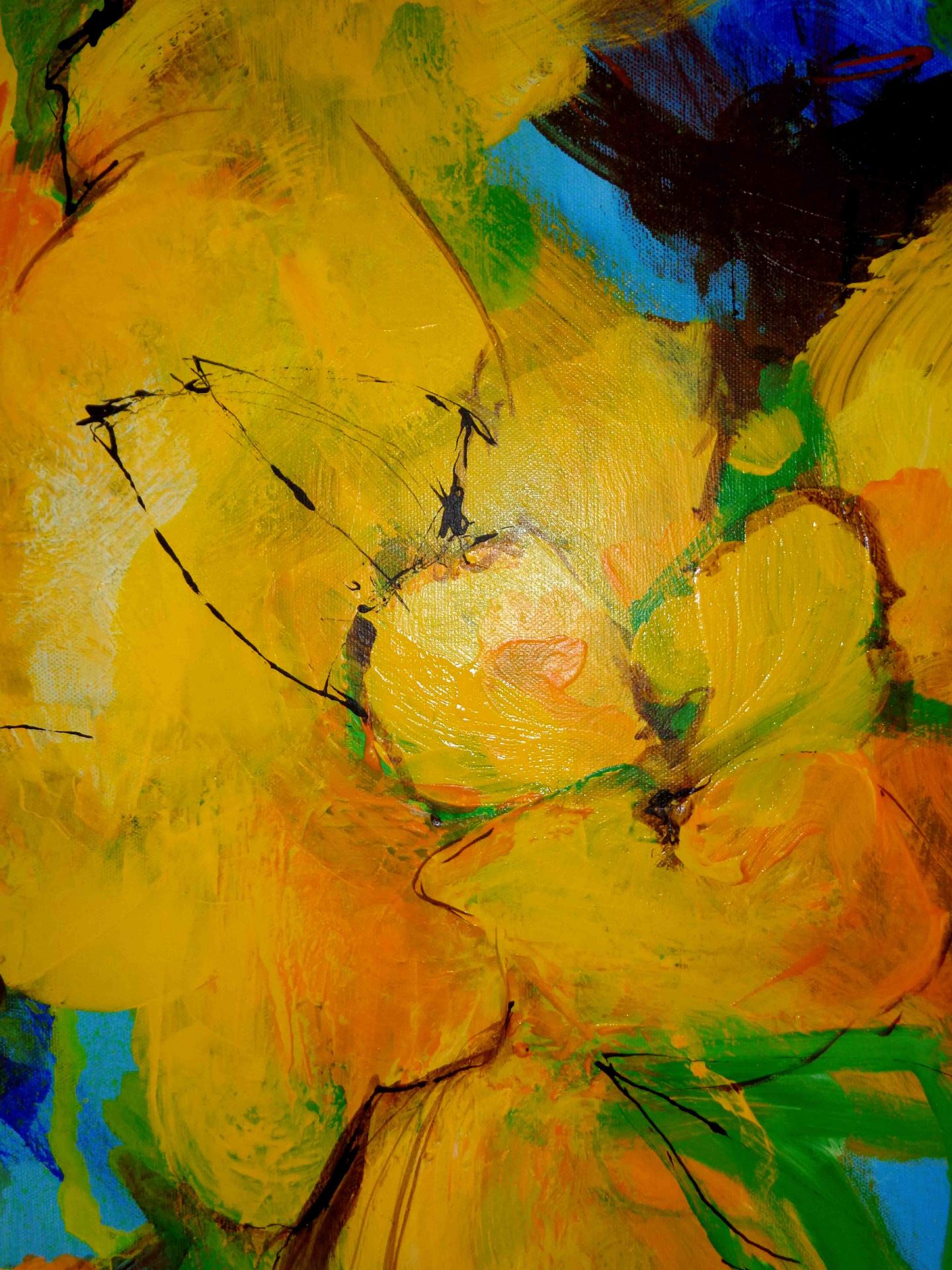 Das Kunstwerk "Gelber Mohn" wurde in Acryl, Tusche und Bitumen auf Leinwand gemalt. Das Außenmaß dieses Unikates beträgt 80 cm x 60 cm x 2 cm.