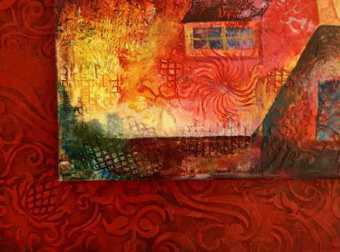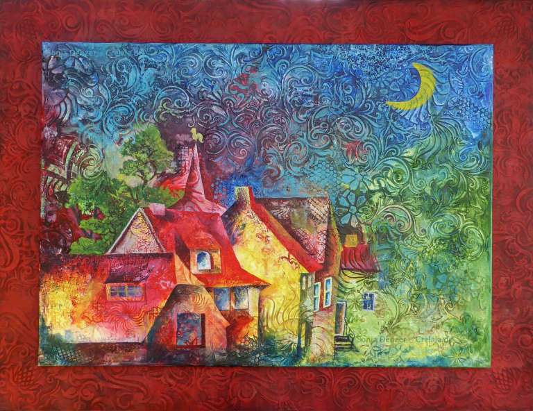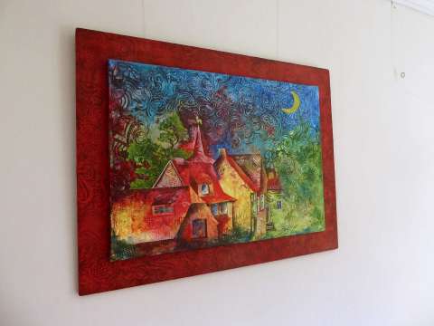 Das Kunstwerk "Märchendorf" wurde in Acryl und Mischtechnik auf Leinwand auf Holzplatte gemalt. Das Außenmaß dieses Unikates beträgt 60 cm x 80 cm x 2,7 cm.