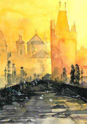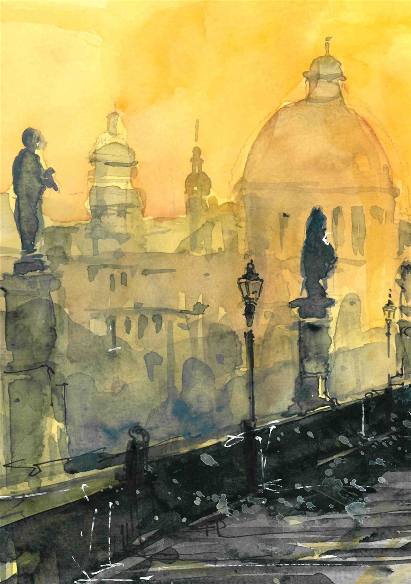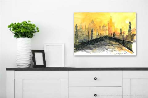Das Kunstwerk "Prag-Karlsbrücke" wurde in Aquarell auf Aquarellpapier gemalt. Das Außenmaß dieses Unikates beträgt 36 cm x 48 cm.