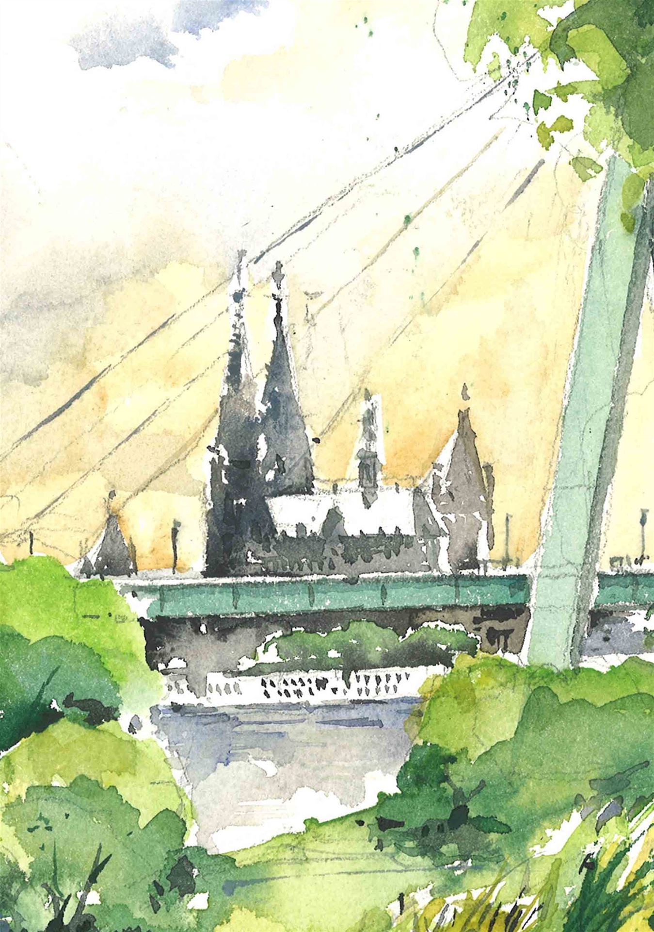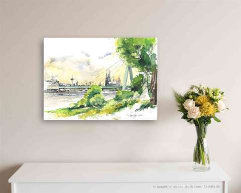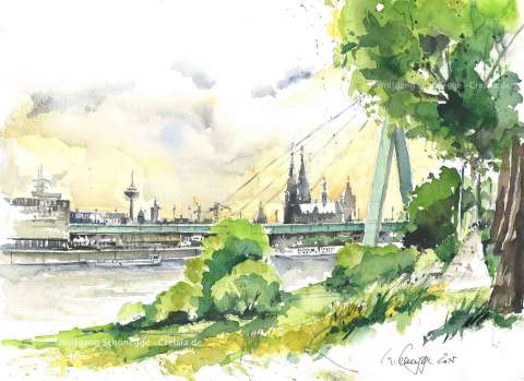 Das Kunstwerk "Köln-Stadtsilhouette" wurde in Aquarell auf Aquarellpapier gemalt. Das Außenmaß dieses Unikates beträgt 31 cm x 41 cm.