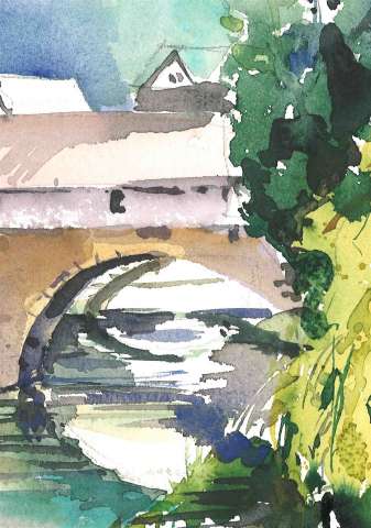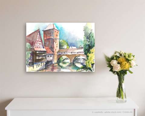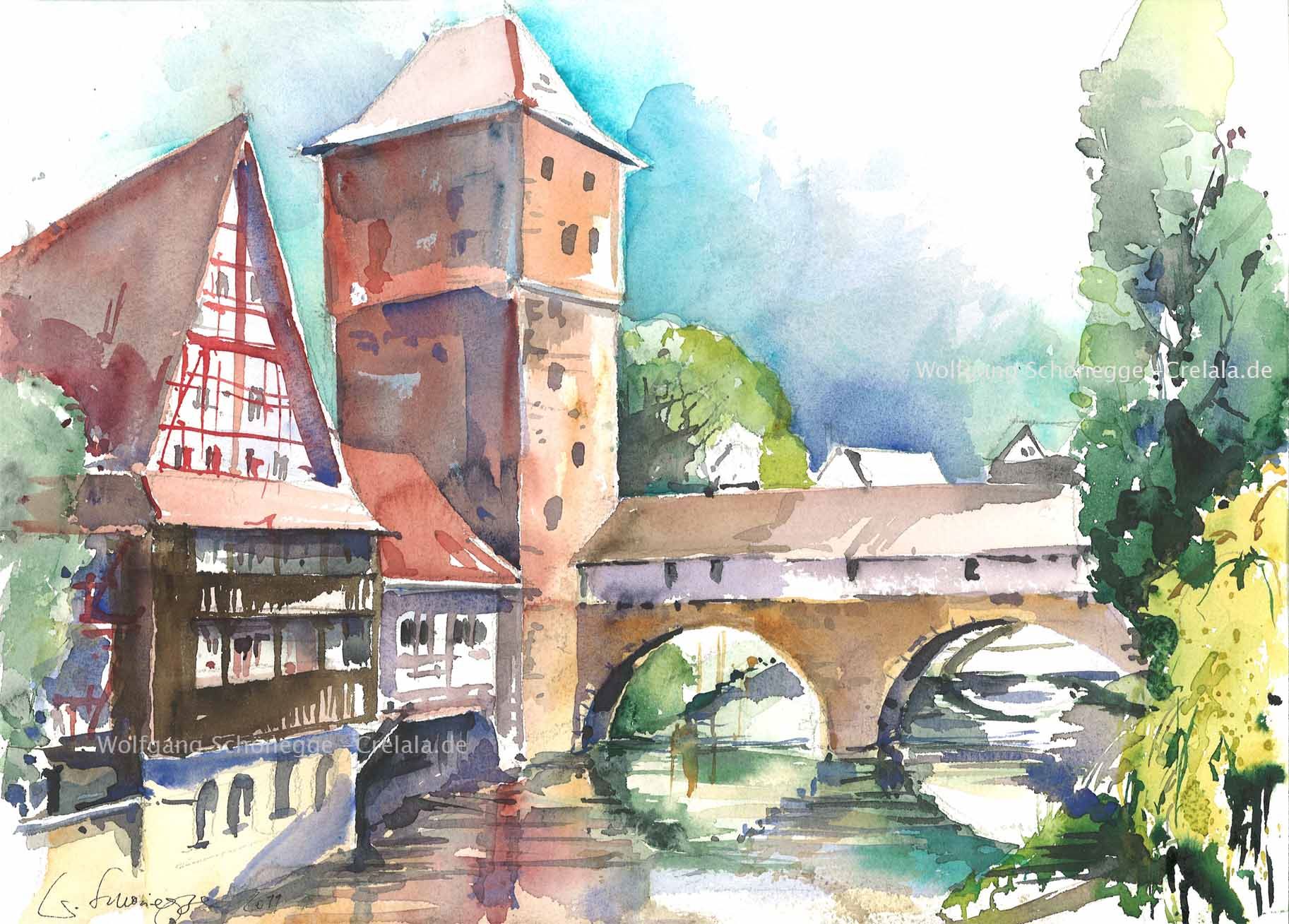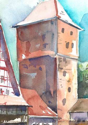Das Kunstwerk "Nürnberg-Weinstadel" wurde in Aquarell auf Aquarellpapier gemalt. Das Außenmaß dieses Unikates beträgt 31 cm x 41 cm.