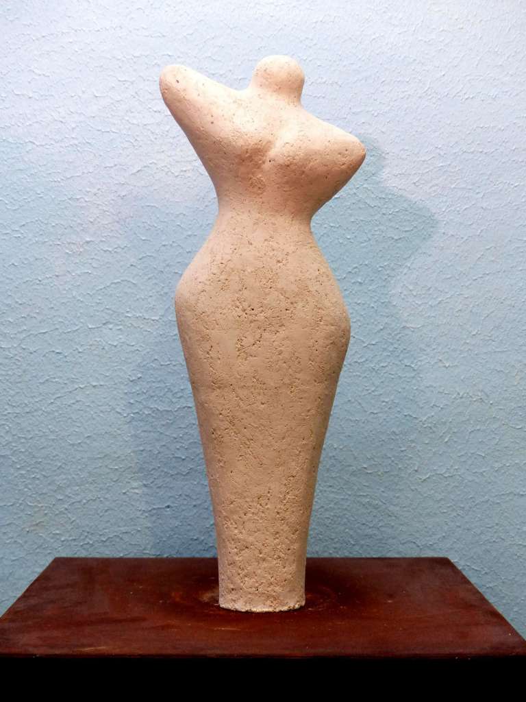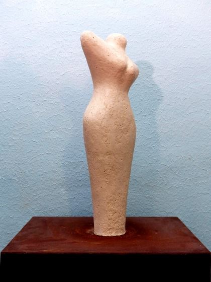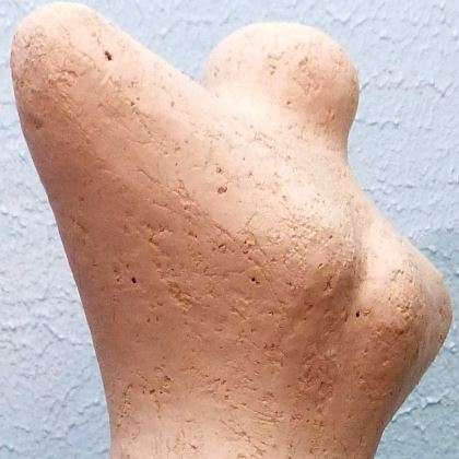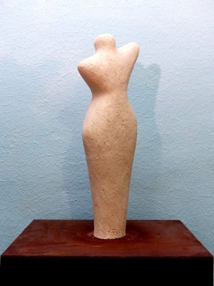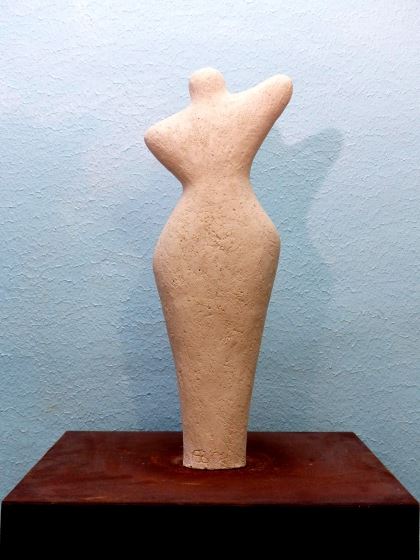 Die Skulptur "Stehende" wurde aus gebranntem Ton erstellt. Das Außenmaß dieses Unikates beträgt 34 cm x 13 cm x 7 cm und hat ein Gewicht von 1,8 kg.