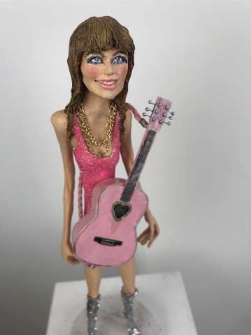 Die Skulptur "Taylor Swift" aus der Serie "Schräge Typen" ist aus Keramiplast mit Aquarellfarbe und Gouache koloriert. Das Außenmaß dieses Unikates beträgt 9,5 cm x 37 cm x 6 cm. Die Skulptur steht auf einem Gipssockel welcher 2,5 cm hoch ist und einen Durchmesser von 10,5 cm hat.