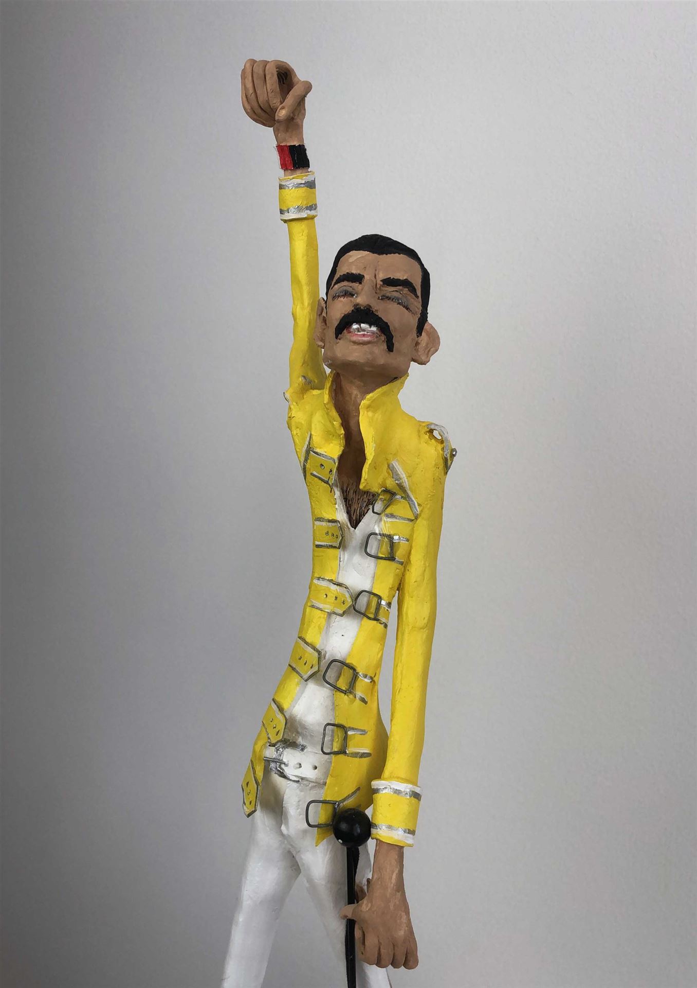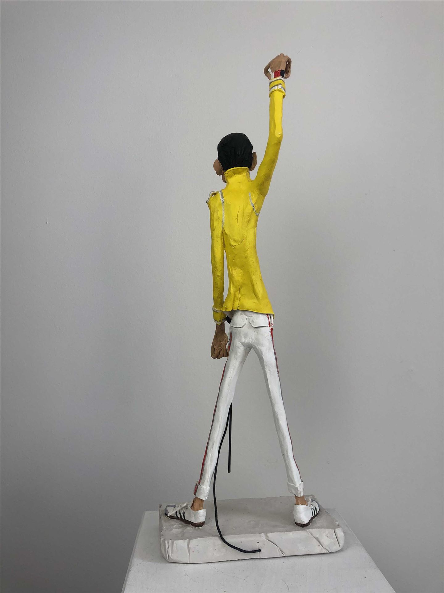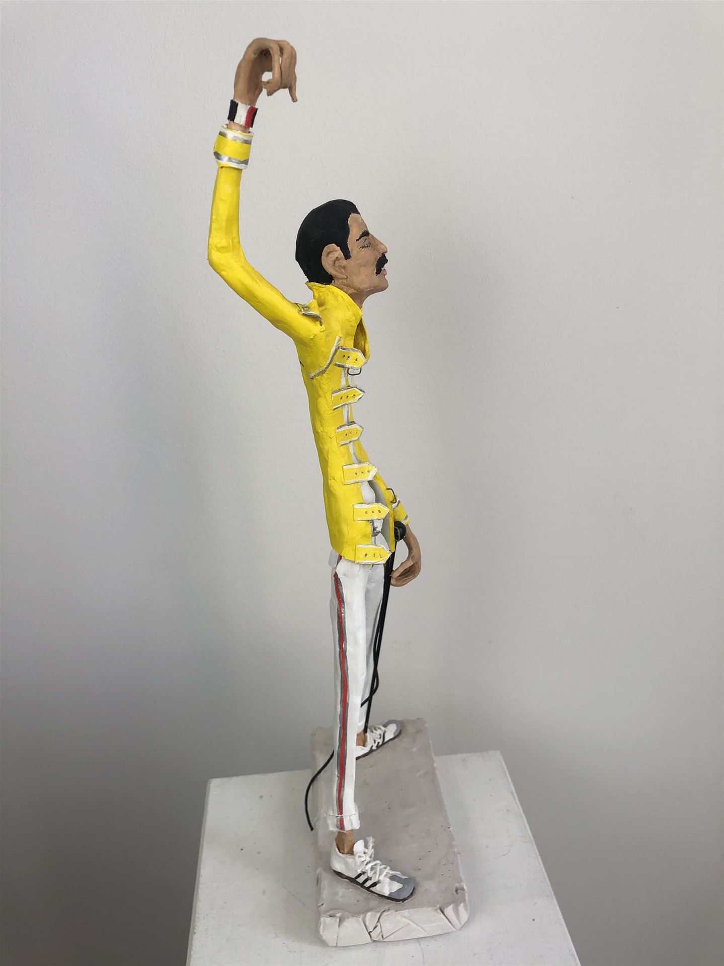 Die Skulptur "Freddie Mercury" aus der Serie "Schräge Typen" ist aus Keramiplast mit Aquarellfarbe und Gouache koloriert. Das Außenmaß dieses Unikates beträgt 15 cm x 42 cm x 9 cm. Die Skulptur steht auf einem Gipssockel welcher ein Außenmaß von 2 cm x 15 cm x 8 cm hat.