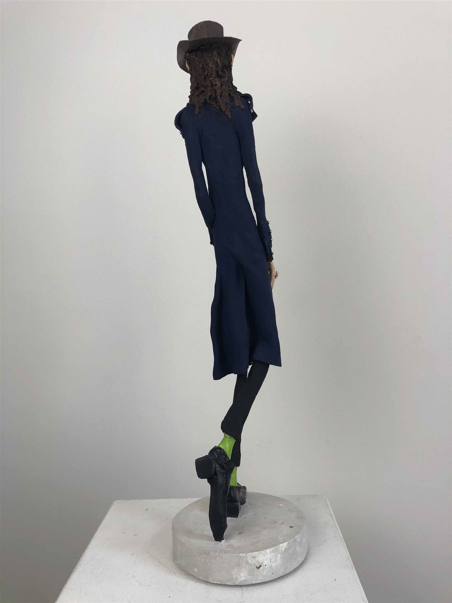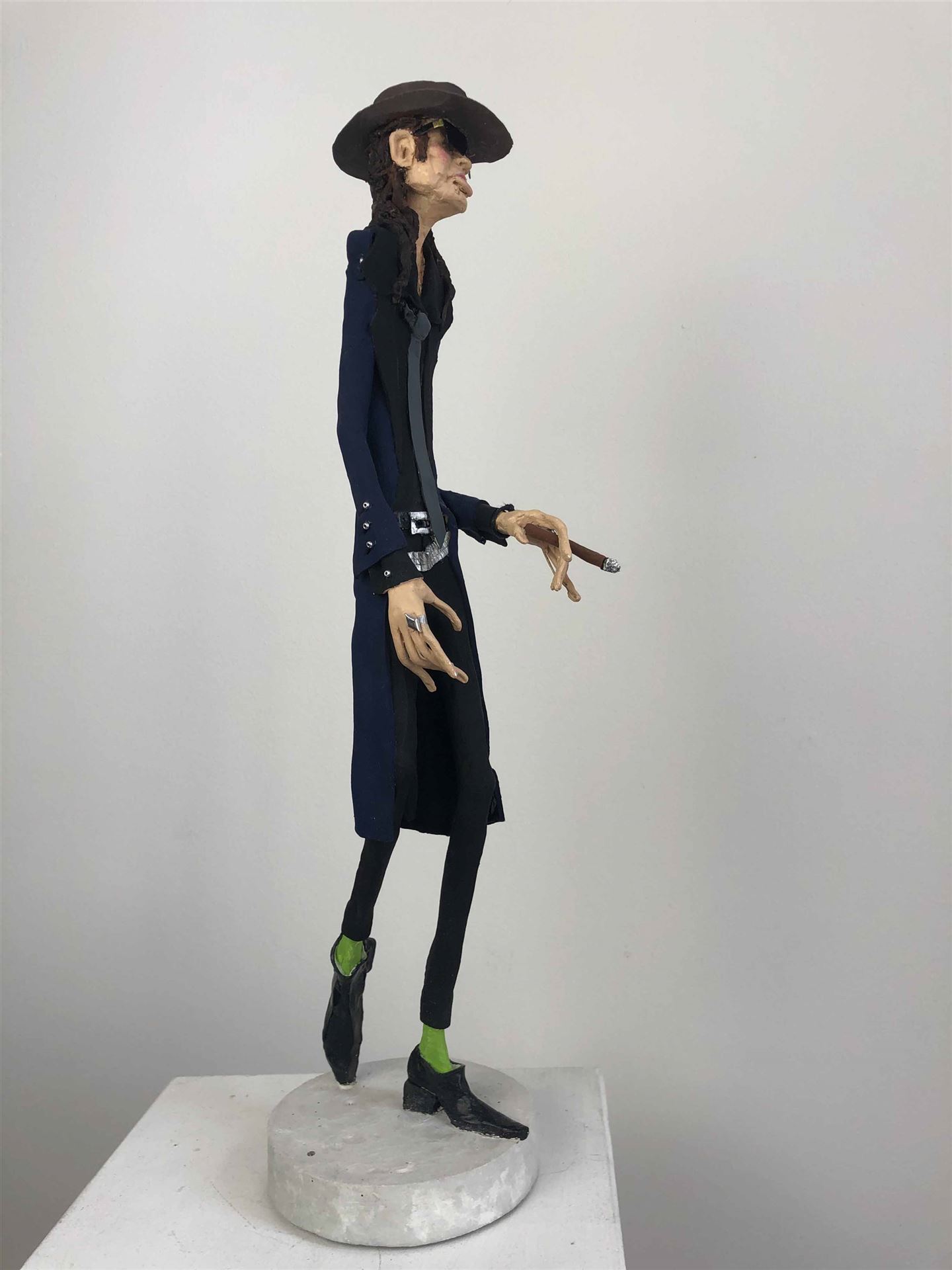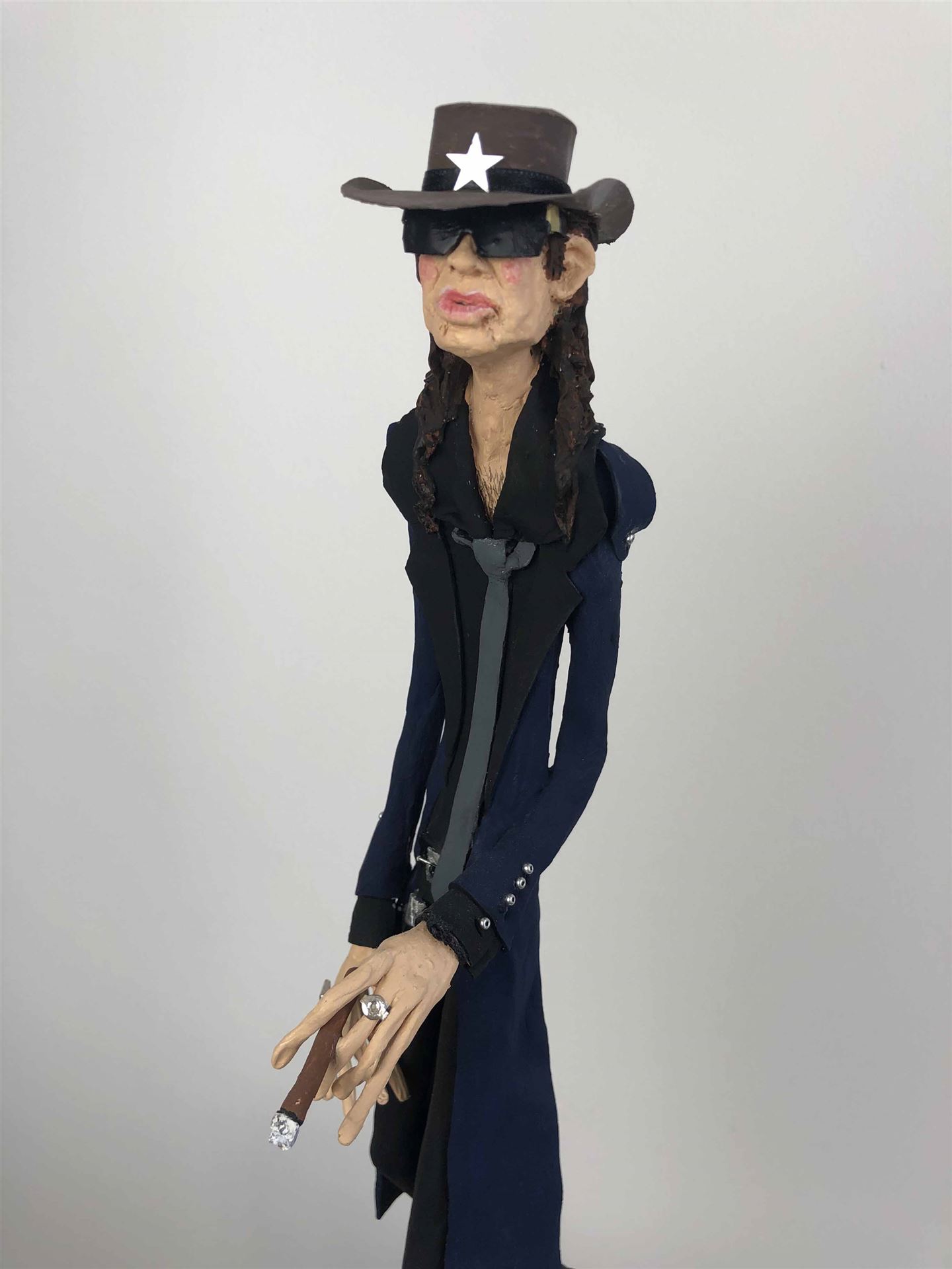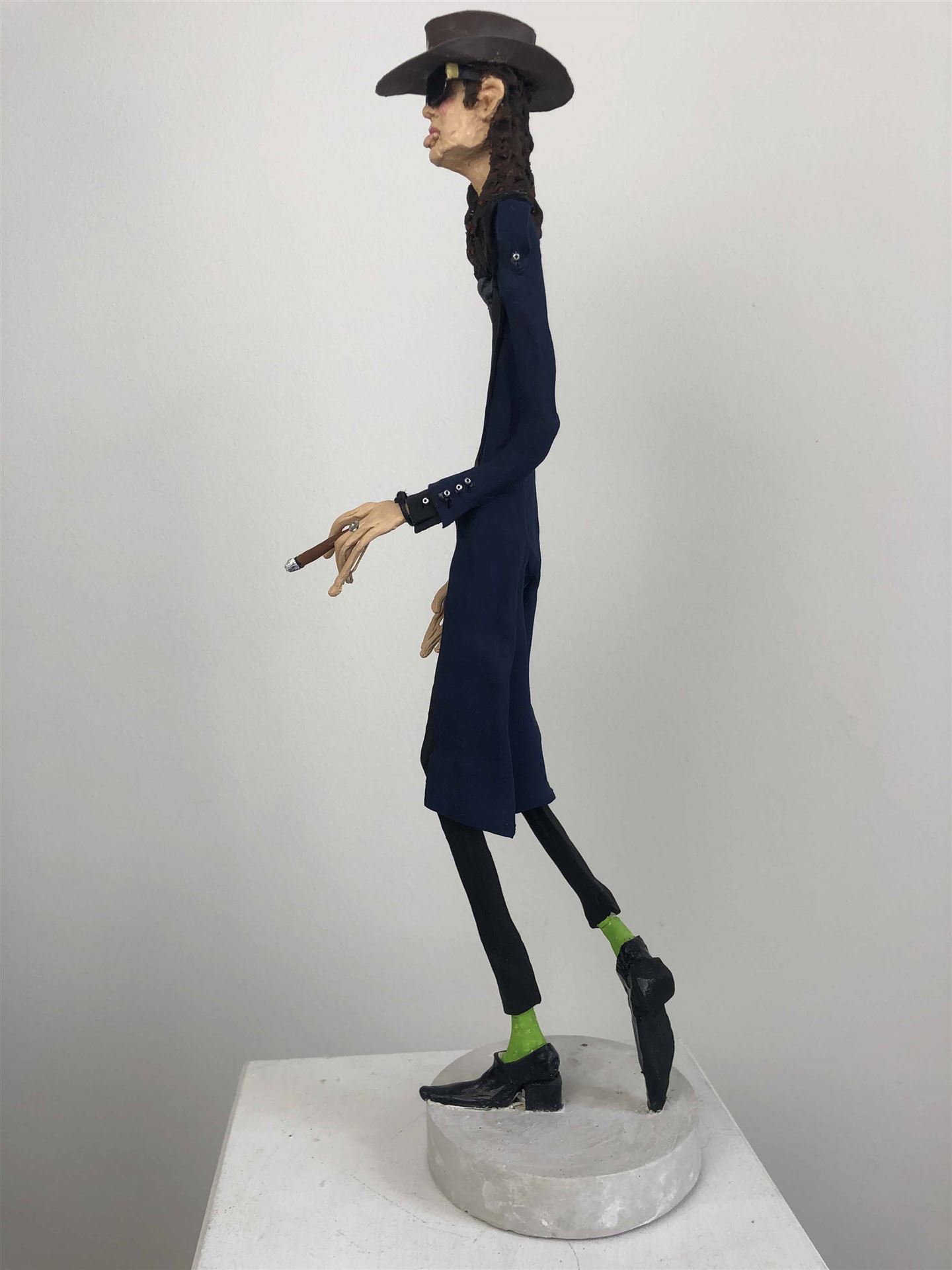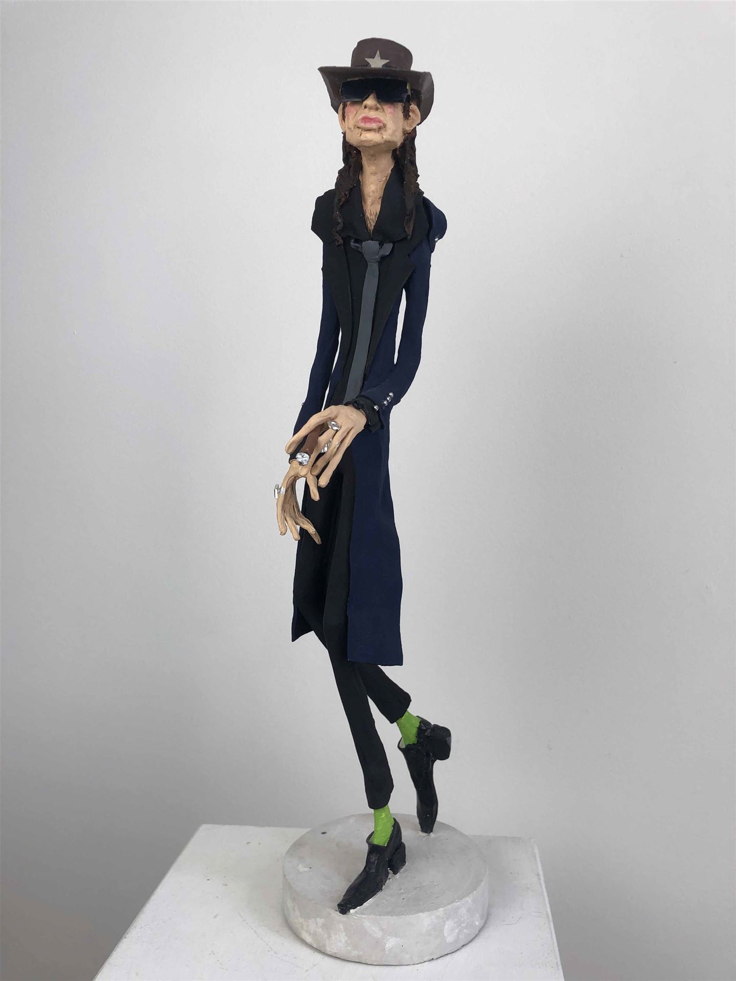 Die Skulptur "Udo Lindenberg" aus der Serie "Schräge Typen" ist aus Keramiplast mit Aquarellfarbe und Gouache koloriert. Das Außenmaß dieses Unikates beträgt 7 cm x 40 cm x 15 cm. Die Skulptur steht auf einem Gipssockel welcher 2 cm hoch ist und einen Durchmesser von 10 cm hat.