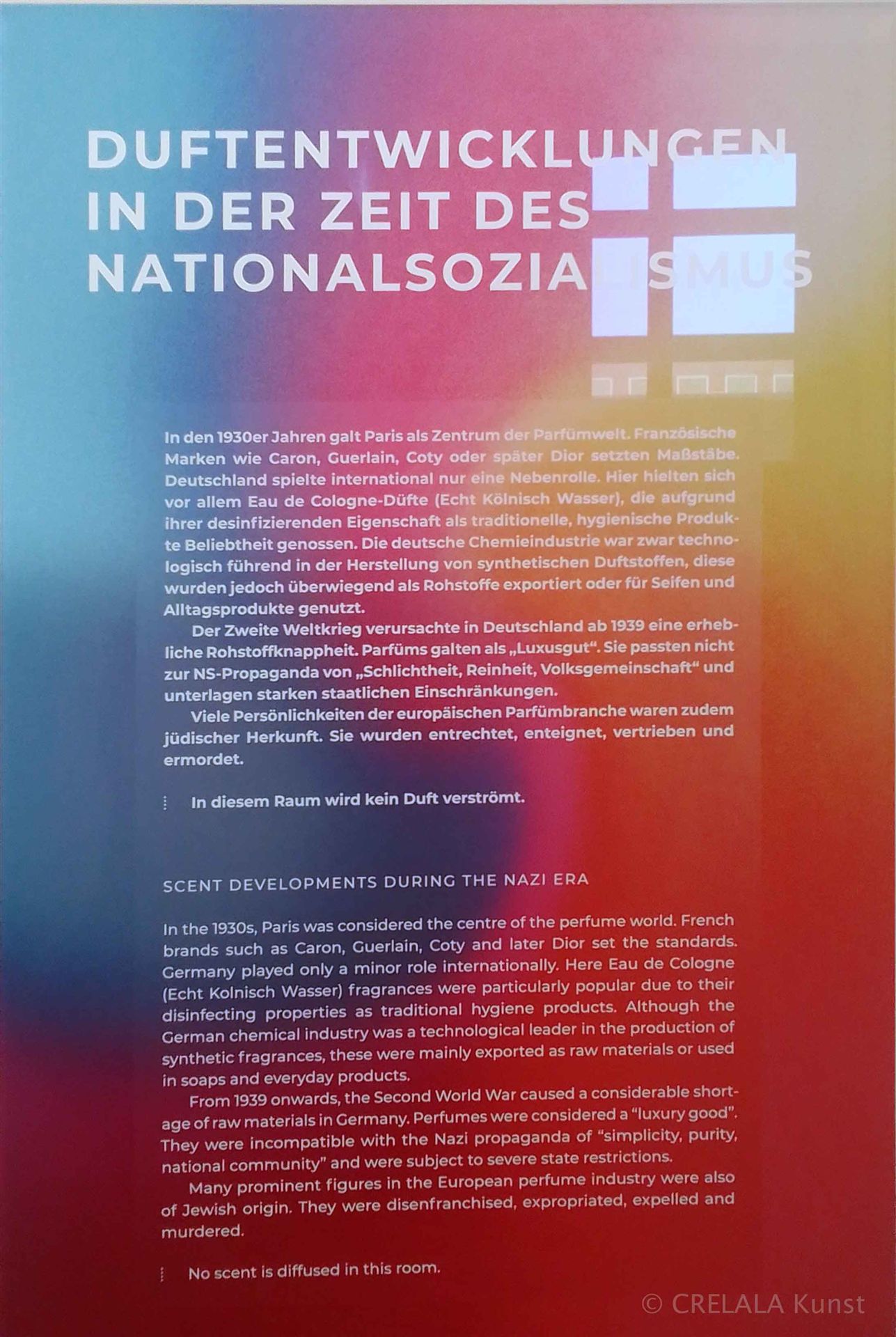 Am Ende der Ausstellung könnte man dem positiven Gedankenansatz den Vorzug geben und die Idee mit nach Hause nehmen: Einfach mal wieder mehr Kind sein und draußen wieder Natur und Pflanzen „erriechen“. „Grün riechen“ Sich mit den gegebenen Sinnen auf die Suche machen nach dem was fehlt in der Welt der Blue-Screens und Neon-pinken Erlebniswelten im Drinnen. - Inzwischen ein schon wieder alter, neuer Impuls, der damals, wie heute als Wirtschaftsfaktor eine Rolle spielt. – Spielen könnte. – Vielleicht. – Oder doch das Draußen ins Drinnen nebeln und weiterarbeiten? - Wald- und Wiesenduft in die Klimawelten der Scyscrapers, und Innenräume holen, und die Arbeitsathmosphäre wohlriechend, positiv bedampfen. – Dann bekommt Arbeitsklima einen ganz anderen Beigeschmack. Klimawandel eine neue Dimension.