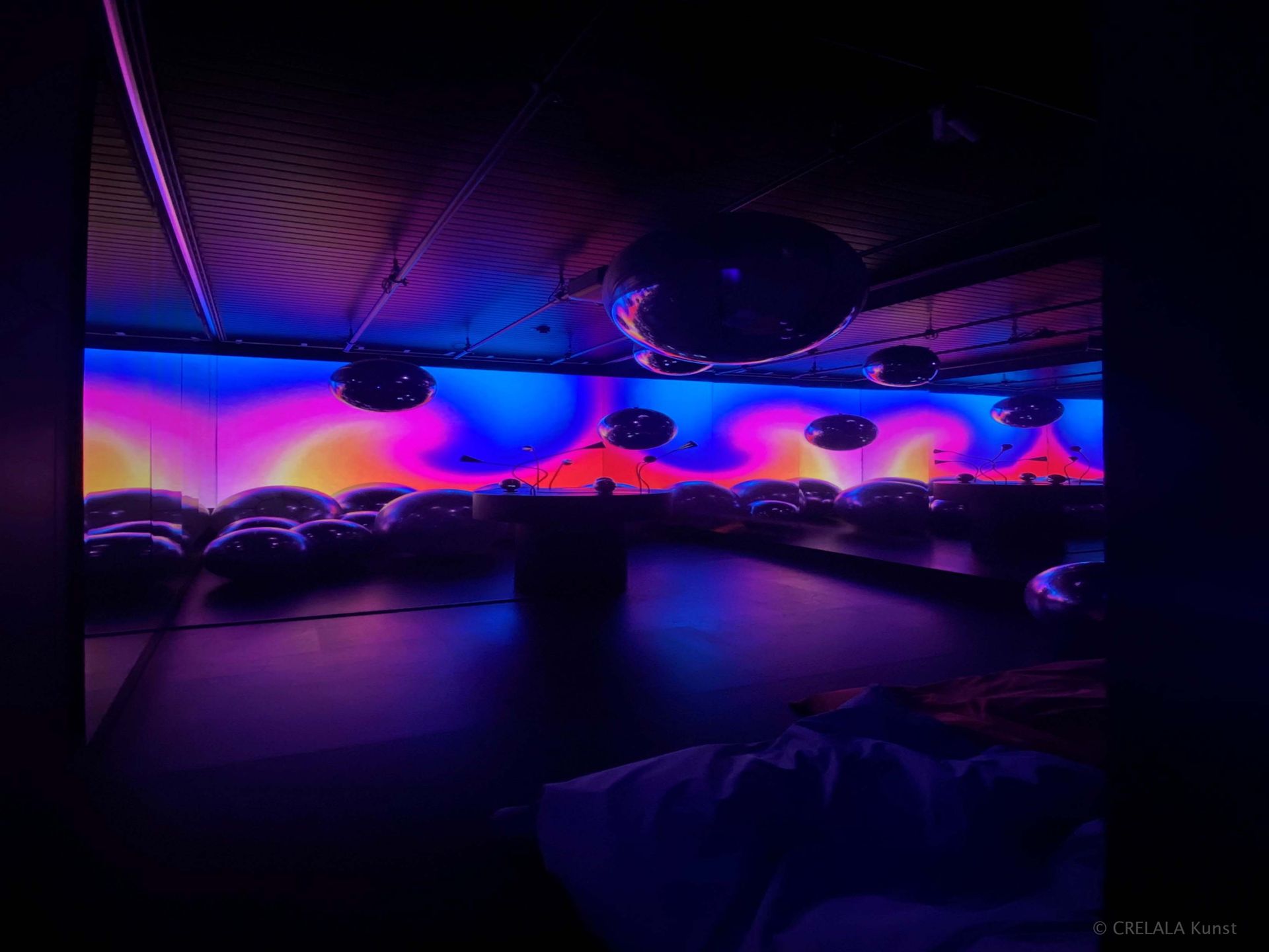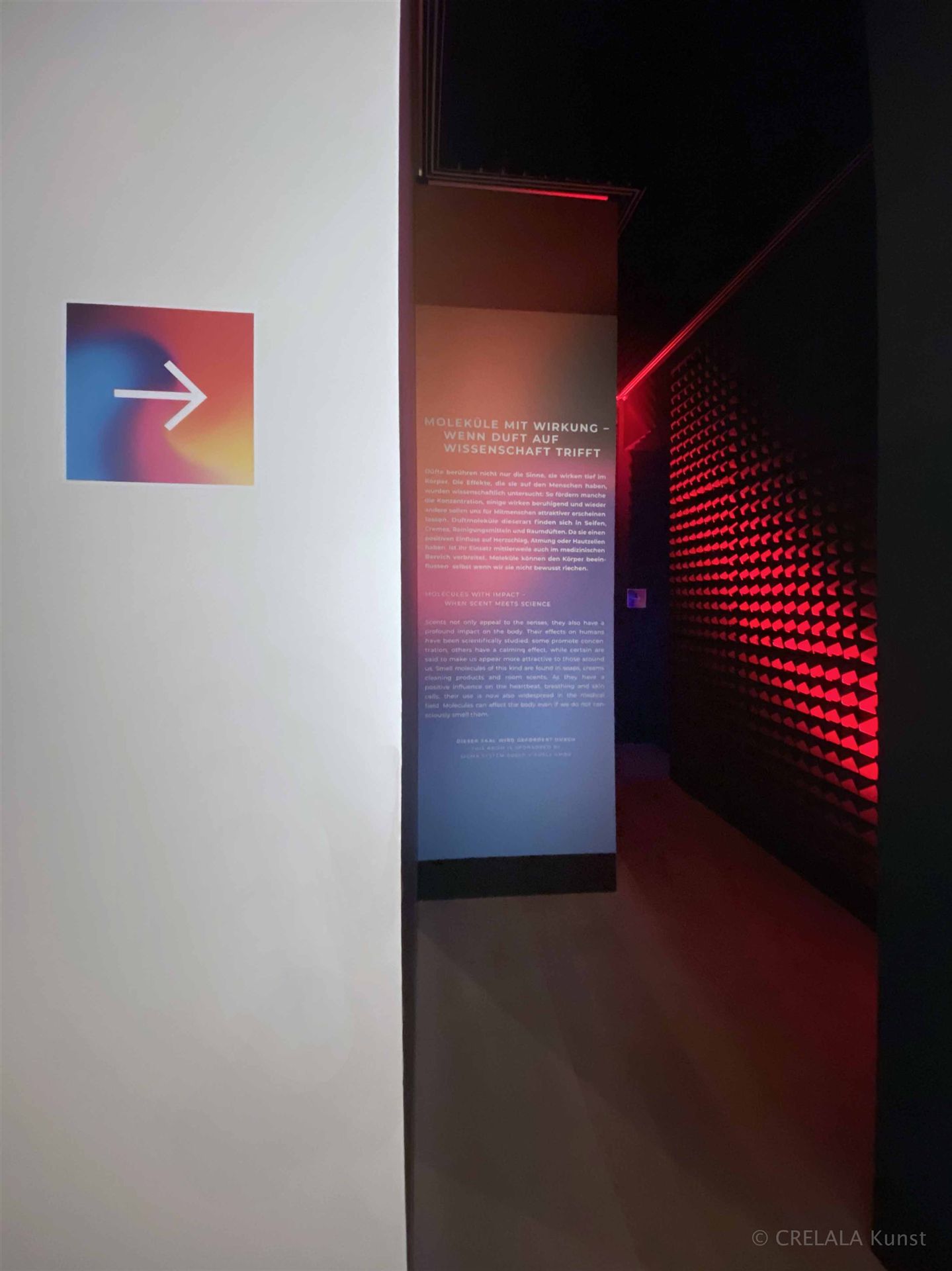 Je nach umgebender Chemie, vielleicht durch Geruchsmanipulative Chemikalien, taucht man in Neonpinke-blaue Welten mit Sitzkissen, Spiegeln und drei mal zwei Geruchs-Erfahrungs-Sets, also Nasenaufsatzvorrichtungen wie Inhalatoren. (Der ausströmende Teilchenstrahl in Gasphase, also Duftstoß, ist stark genug, dass man unhygienischen Kontakt vermeiden kann.) Je nach Molekül bzw. molekularer Zusammensetzung riecht man die unterschiedlichen Gerüchen.