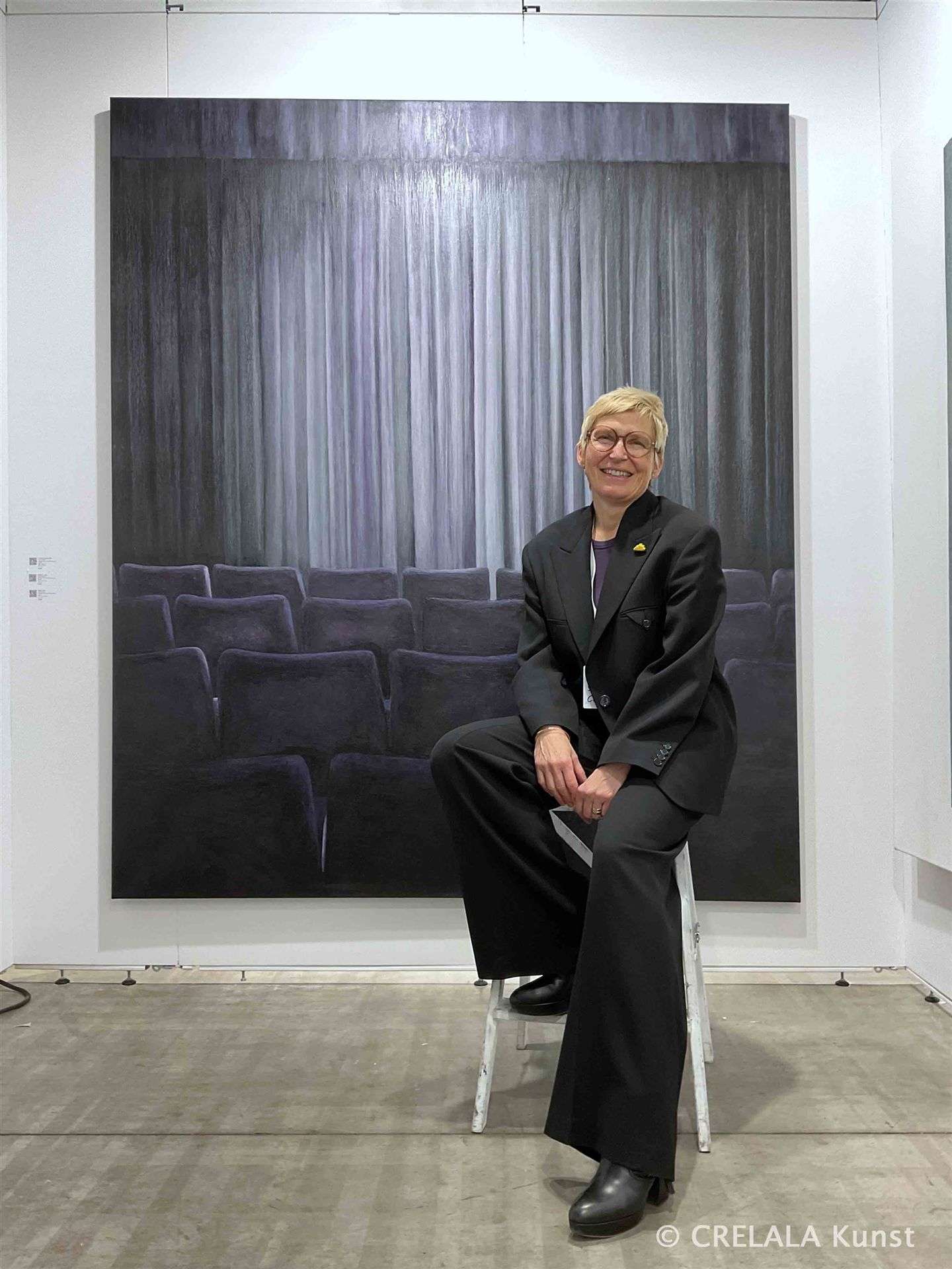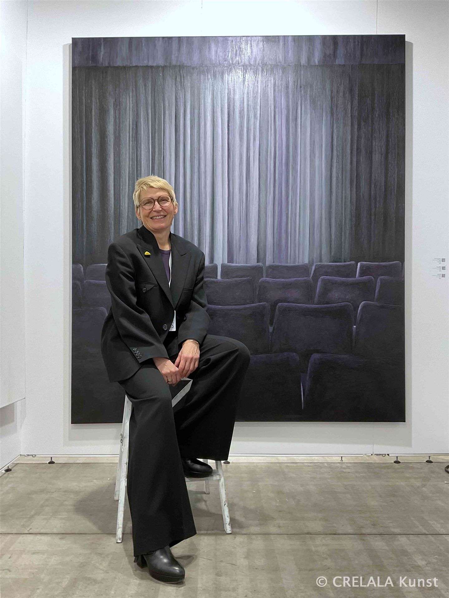 Ein leerer Kinosaal und der geschlossene Vorhang? Warten im leeren Raum. Entstanden während Corona. Was macht das Großformat mit uns, was erzählt uns die Geschichte dazu? Was will uns die Kunst beweisen?