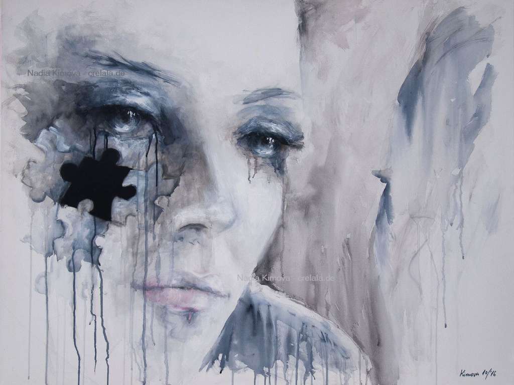 Nadia Kimovas Fotografien sind bizarr und lassen viel Raum für Spekulationen. Man taucht ein in eine fragile Welt, die düster und unheilvoll, ja zerrissen und kalt wirkt. Gewalt, Verbrechen, die Frau als Opfer, das Kreuz als Symbol, das Unaussprechliche findet seine eigene Sprache. Immer wieder verbindet Nadia Kimova Schrift und Geschriebenes mit Gesichtern und man ahnt, es geht um die Gedankenwelt, die sich aufbaut, aus den Spuren des Lebens. Eine Symbolik für all jene, die sich verloren und allein gelassen fühlen. Das fehlende Puzzleteil wie bei dem Gemälde Narben, ist wie ein Markenzeichen. Man ist geneigt zu interpretieren, sucht die Lösung in den Werken und wird hineingezogen in die andere, fremde, offenbar grausame Welt. Manch einer mag geneigt sein einen Aufschrei zu erkennen, doch vielmehr ist Nadia Kimovas Kunst der Versuch aufzurütteln und den Blick zu schärfen für das, was um einen herum vor sich geht. Der Geist beginnt aus dem, was er sieht eine eigene Wahrheit zu formen und er bedient sich eigener Erfahrungen und Erlebnisse. Nadia Kimovas Kunst ist einzigartig und trägt eine ganz eigene Handschrift.
