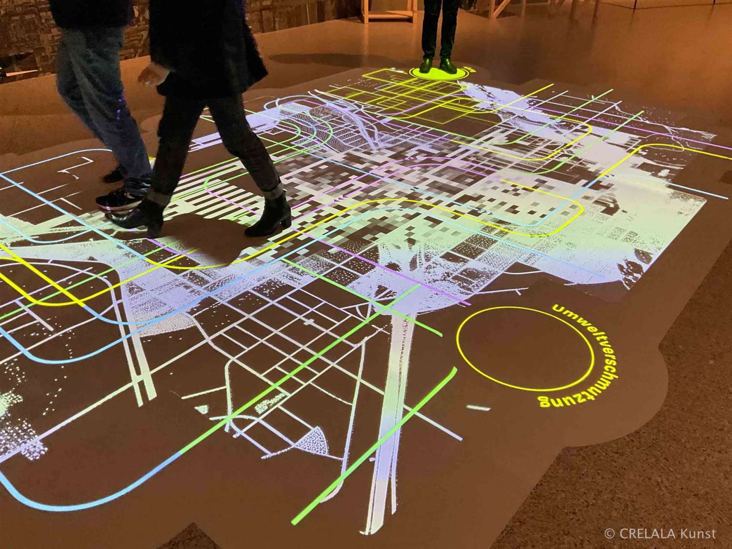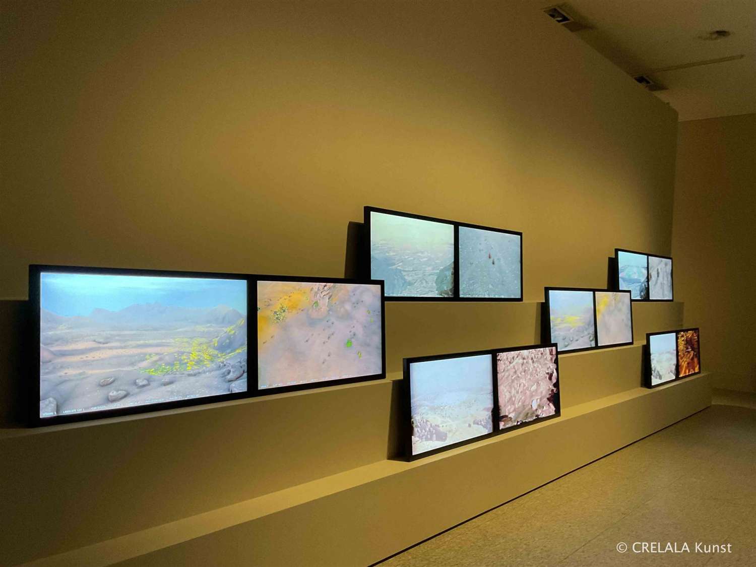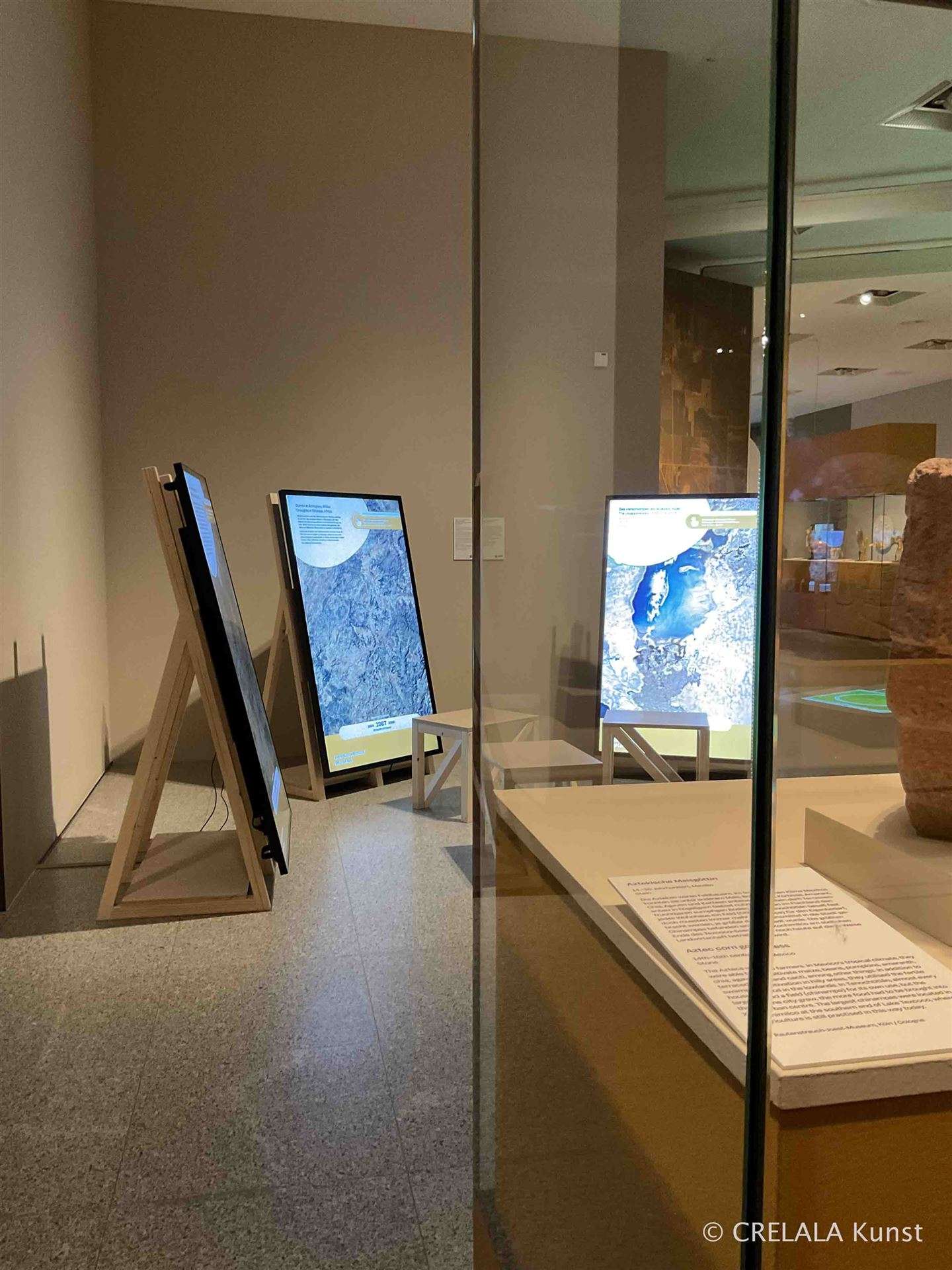 Nachhaltige Rekultivierung und das landwirtschaftlich genutzte Land wird in Augenschein genommen. Auf großen Monitoren, Hochkant gestellt, wie Smartphones laufen Filme mit den Veränderungen von Land und Oberflächen über die Zeit. Besonders drastische Änderungen, wie das Verschwinden des Aralsees kennt man. Auch die Landschaften und Böden Äthiopiens und Mexicos geben zu denken.