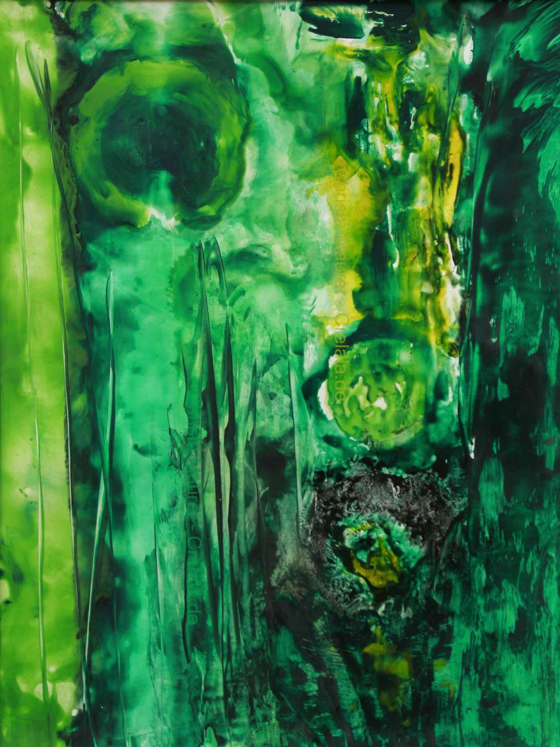 Und die Algenblüte liefert Nährstoffe auf der einen Seite, kann vielleicht nutzbar gemacht werden zur Ernährung, liefert vielleicht Energie, fürs Heizen, oder Kühlen, je nachdem, tötet aber auch ab, auf der anderen Seite, wie man weiß, von El nino, dem Christkind, und vielleicht soll Christa Maurers grüne Hölle genau daran erinnern. Monochromatisch, in Enkaustik auf Papier, vielleicht dem Klimawandel geschuldet, dem Artenschutz, oder -Wandel der Lebensbedingungen und Gewohnheiten schlechthin.