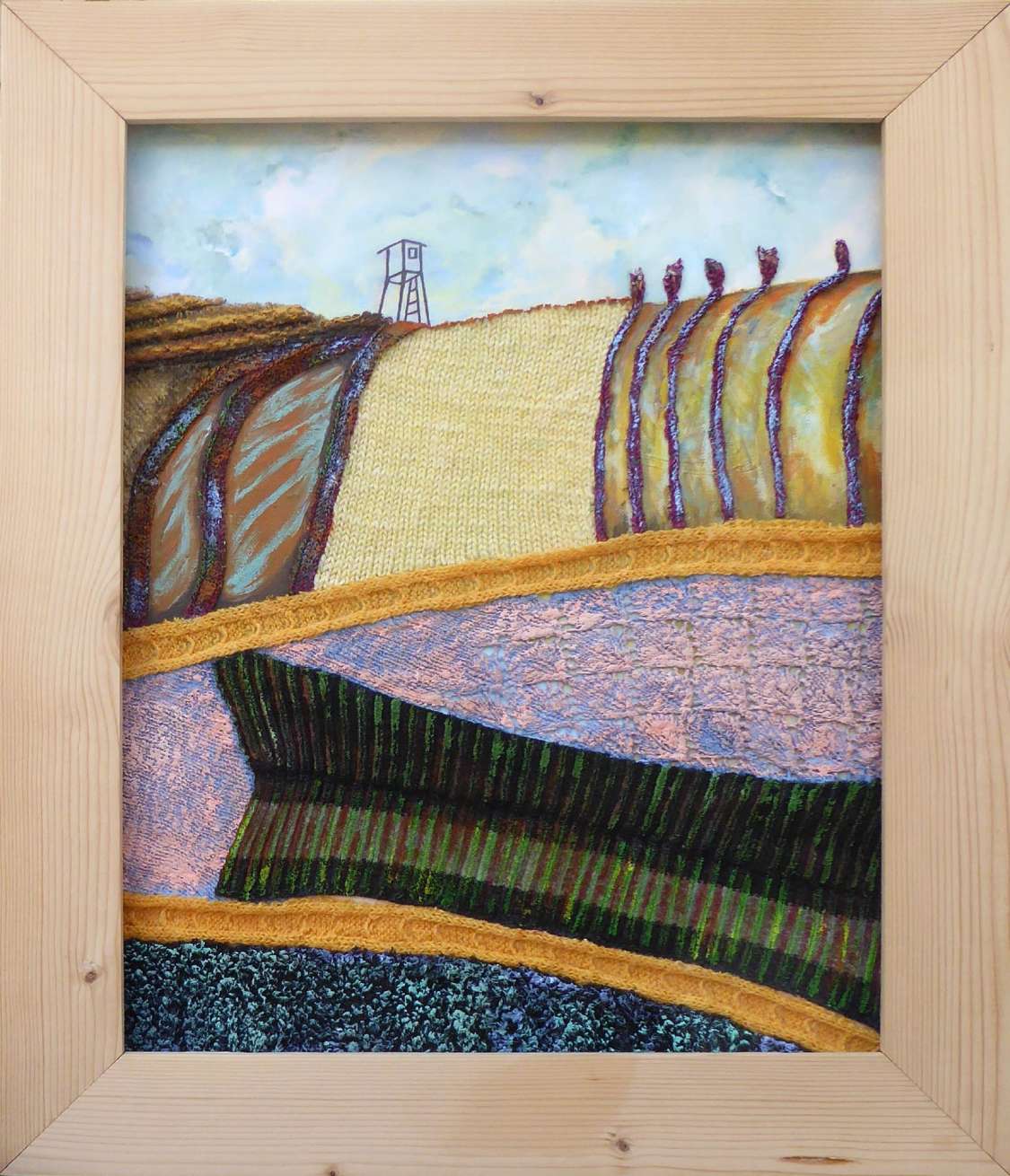 Die Satellitenansicht von Corina Hagedorn-Hähnel ist eine Mix-Media-Arbeit mit Gittergefügen, die über dem Werk liegen und vielleicht die kubische Einteilung der Landschaft, bzw. die Einteilung der Landschaft in Kuben, andeuten sollen.
