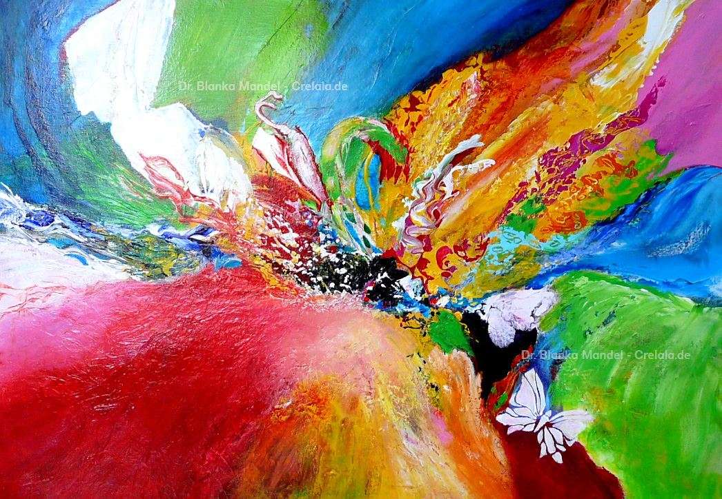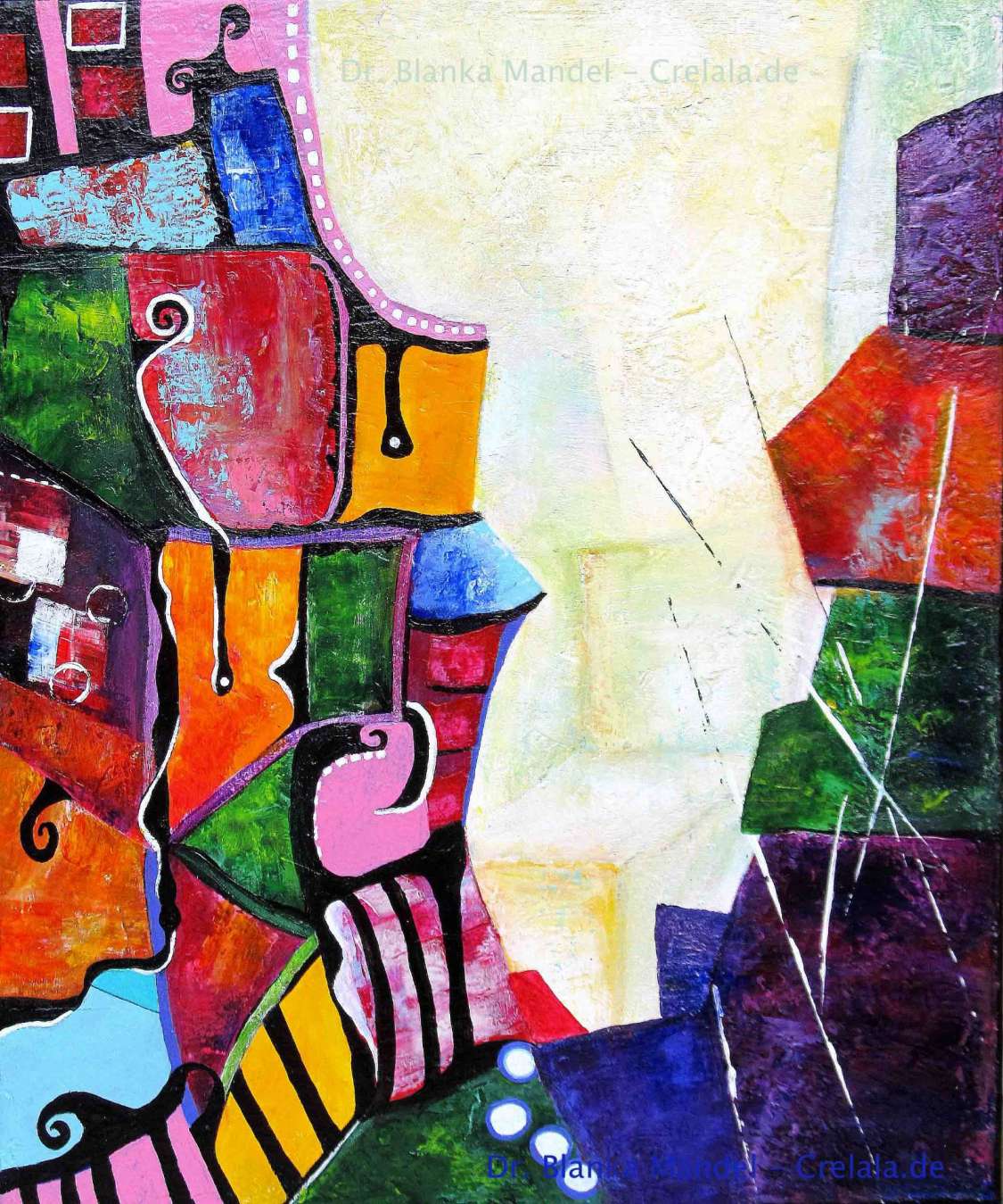 Dr. Blanka Mandel lenkt ab. - Sie inspiriert durch optische Verführungen, malt märchenhafte Szenen, farbenfroh und metaphysisch, in hellen Farben, mutmachend, um den Blick in eine Richtung zu wenden, der einen neuen Impuls gibt, um neue Energie zu tanken und Kraft zu sammeln. Die abstrakten Komponenten ihrer malerisch-kommunikativen Fähigkeiten sind Mutmacher! Man darf, ja man soll hinschauen, eintauchen, innehalten und träumen.