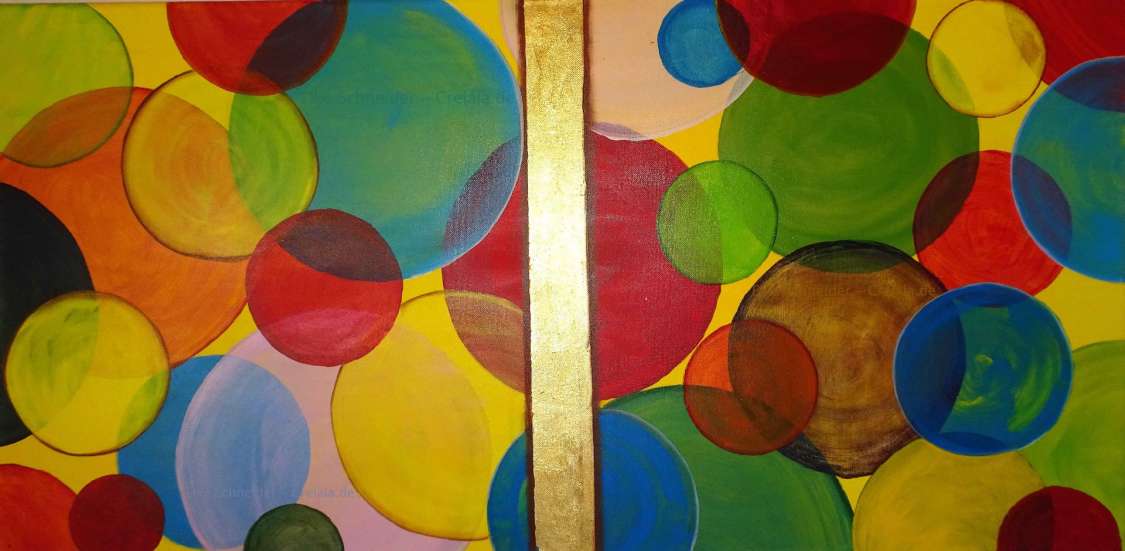 Die Farbigkeit sorgt fürs Befinden. - Wohlbefinden? Warum machen ein paar Farben und nur wenige Formen, bunte Kreise, und Linien im Grün, schon einen Sommer aus? Welche Rolle spielt der hellblaue Hintergrund?