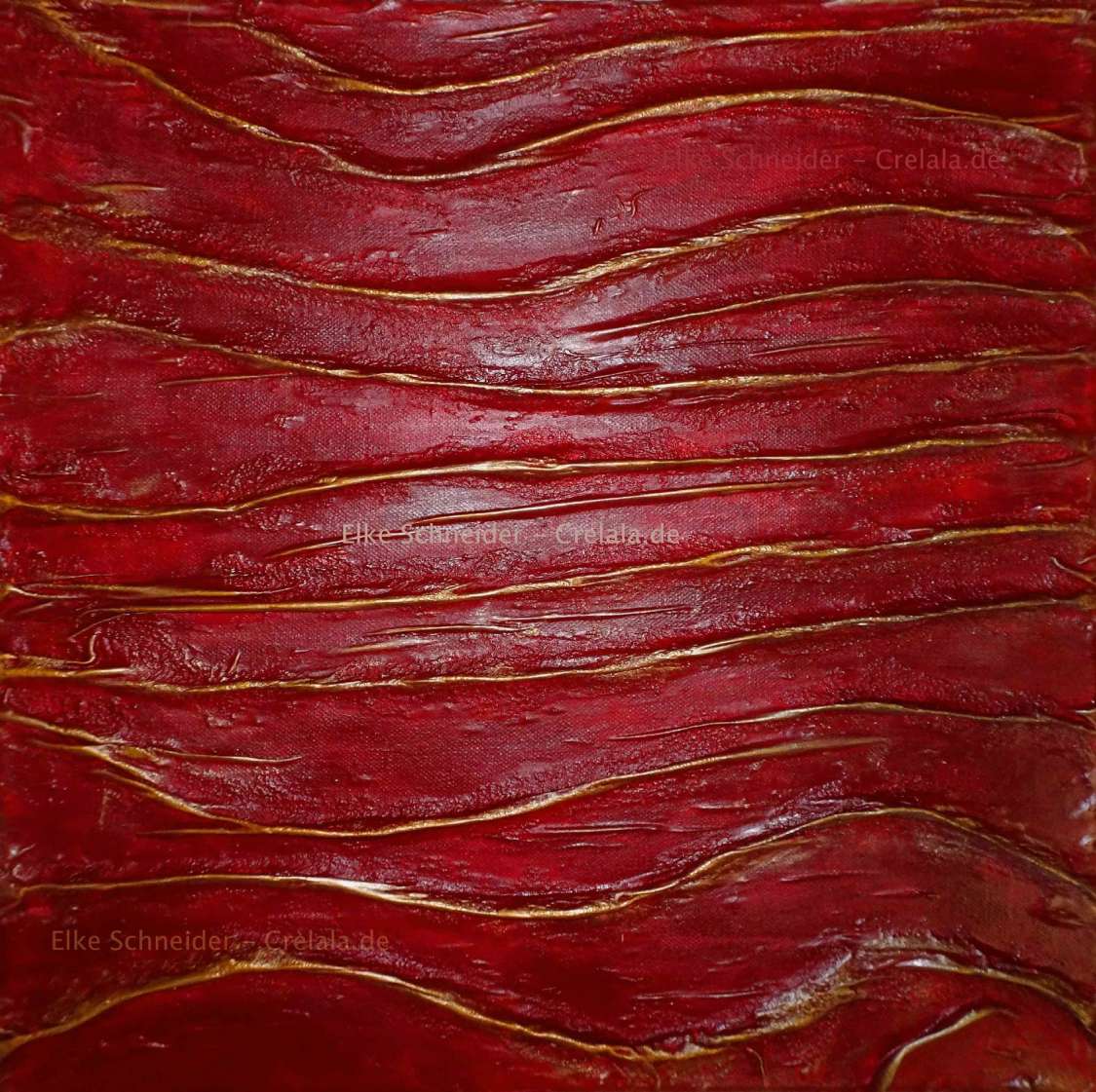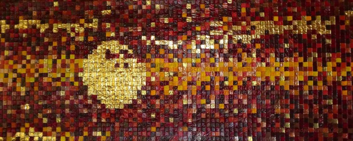 Mitten in dunklem, tiefen rot, acrylisches Gepixel und ein paar goldene Teilchenquadrate haben sich offensichtlich aus dem Verbund gelöst und verirrt. Irgendwo in der Ansicht. Zwischen gelb, orange…rot. - Nur das Gold glitzert. Schimmert. Strahlt!