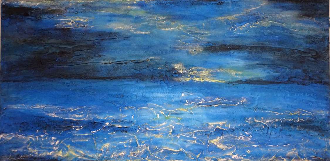 Das man vielleicht den Goldstaub bei Elke Schneiders Mondaufgang als Wellenkämme auf unruhigem Wasser erkennt hat vielleicht mit dem Wissen über Teilchen zu tun. Strahlende Oberflächenkanten. Der Mond noch nicht sichtbar, nur sein Licht strahlt schon ins tiefe Blau einer Nacht hinein. Über einem unruhigen Wasser, einem weiten Meer der Moleküle, die zerstäuben, auseinandergetrieben werden, von den Kräften des Fließens, da ihr Zusammenhalt nicht fix, nicht starr, nicht fest ist. Und durch die Weiten der Ozeane werden die Teilchen in den Molekülketten und Netzen getragen und verteilt, erreichen ferne Kontinente und Inseln und bewirken dort vielleicht, was man sich hierzulande nicht vorstellen kann. Tiefgreifende Veränderungen. Neue Arten vielleicht. Und mit dem Gedankenansatz, dass alles mit allem zusammenhängt kann man sich mit einem Mal vorstellen, dass das Wasser, das rund um den Globus immerzu in Bewegung ist, dazu führt, dass wir alle auf irgendeine Art und Weise miteinander vernetzt sind. Und das auch ohne Internet. Da darf man ganz getrost mal dem Mondaufgang entgegenfiebern und sich Gedanken darüber machen, dass das Elixier des Lebens, das Wasser, uns alle imstande ist zu tragen. Auf welche Weise, das lassen wir offen.