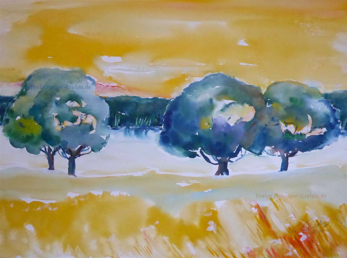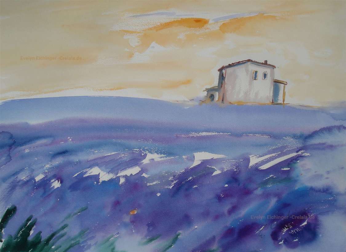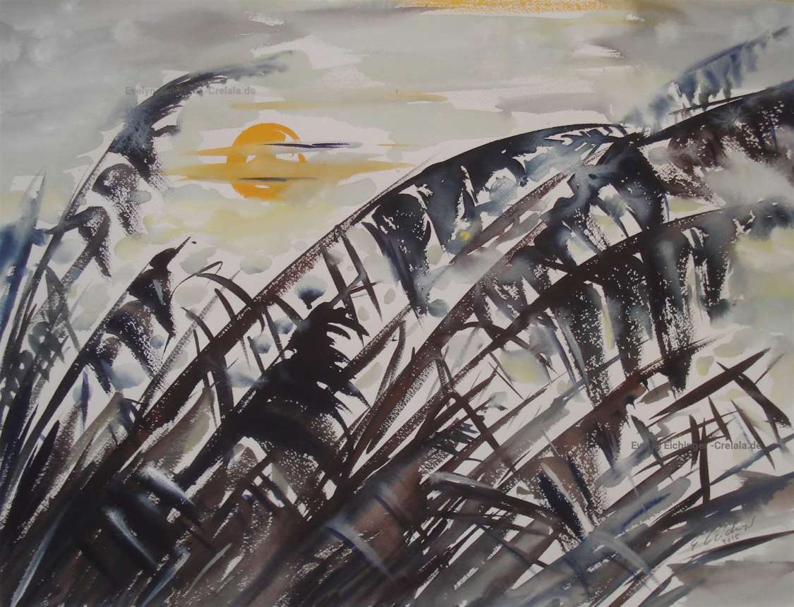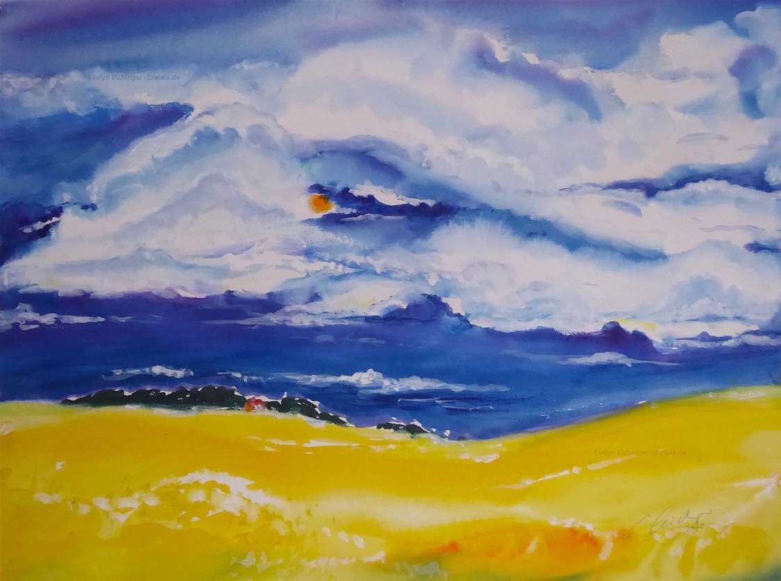 Das Aquarell als Kunstform ist mehr als nur eine Spielerei. Ganz allgemein kann Aquarellieren als das Bestreben bezeichnet werden sich die Eigenschaften von Wasser nutzbar zu machen. Das Element zu „erlernen“. Es zu „erfühlen“. Es zu „begreifen“. Mit ihm in Dialog zu treten. - Kein Wunder, dass Evelyn Eichinger immer wieder Wasser und Landschaften am Wasser malt. - Vielleicht sollte man bei der Technik „Nass in Nass“ besser sagen: „Landschaften entstehen lässt“. – „Werden“ lässt. - Das Spielen mit dem Element und am Ende das Erschaffen eines Bildes, das dem eigenen Willen entspricht,… das Wasser zu bändigen und ihm den eigenen Willen aufzuzwingen, ist das Resultat. - So könnte es der Eine formulieren. - Ein Anderer würde vielleicht sagen, Aquarellieren ist das Liebesspiel zwischen Mensch und seinem Urelement, das er ist und aus dem er stammt. - Es verstehen zu lernen, es zu lieben und sich seine Eigenschaften zunutze zu machen…den Geist in den Wassern zu bändigen… Evelyn Eichinger hat sich auf diese Reise begeben. Sie selbst formuliert folgendermaßen: