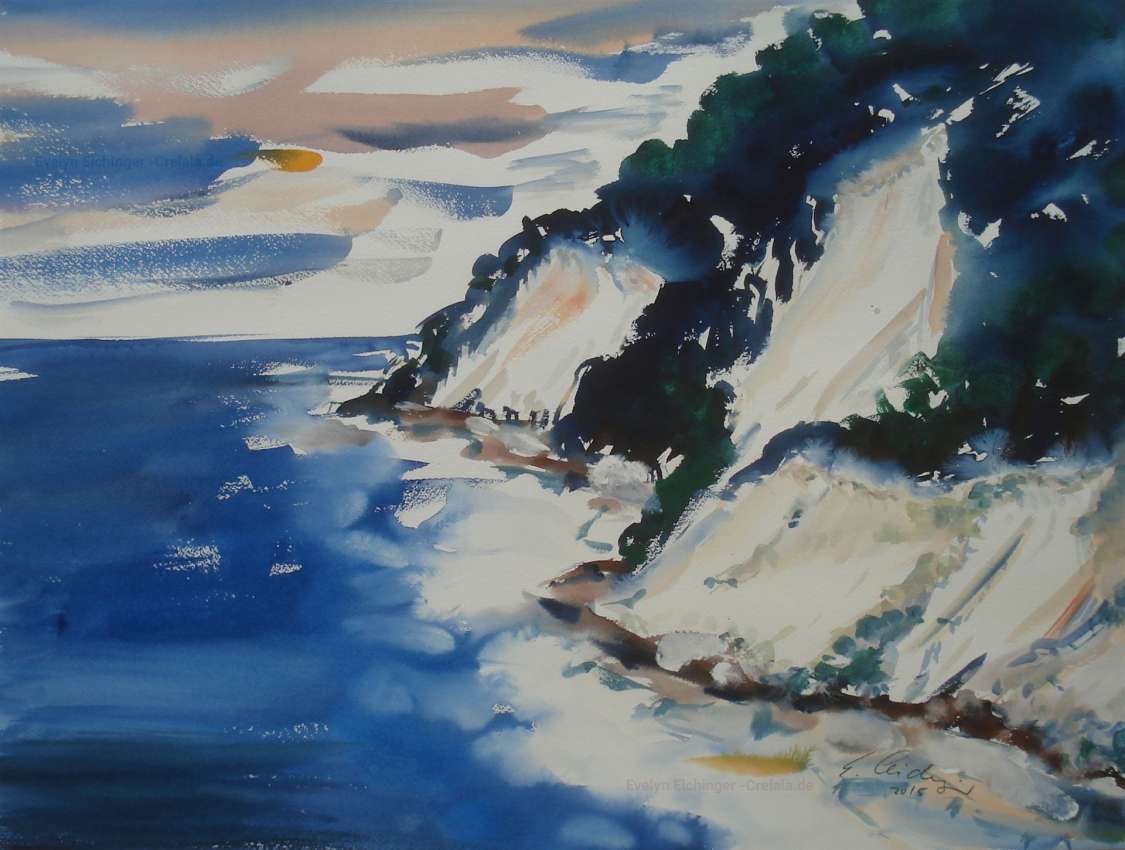 Verweilen, das möchte man,… vielleicht an einer Kreideküste, wie an der „Waterkant“ Rügens, wo das Wasser über dem hellen Fels azurblau leuchtet, wenn die Brandung nicht windgepeitscht aufschäumt und dem weichen Fels seine kreidezeitlichen Geheimnisse mit Belemniten und Kieselsäure-opaligen Feuersteinen in Höhlen oder Abbrüchen entlockt.