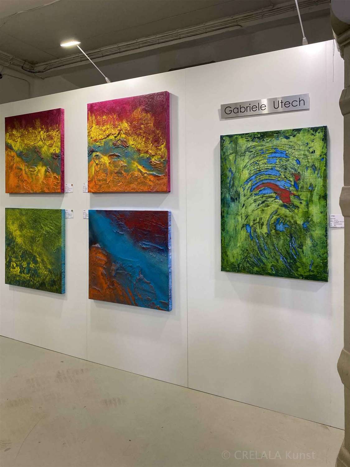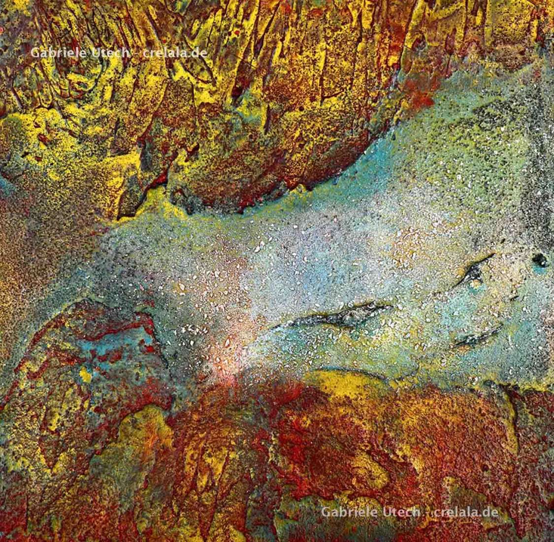 Kann man je nach Material ablesen, welche Schrumpfungsformen sich bei Trocknung ergeben? Ist eine bevorzugte Form erkennbar? Ist eine Regel bei dem Materialverhalten erkennbar? Ablesbar? Auswertbar? Das technische Ergebnis spielt für den Betrachter vielleicht keine Rolle, das sich ergebende Bild der expressiven Arbeiten soll WIRKEN! -je nach Farbgebung und Pigmentverteilung beruhigend oder anregend. Der Einsatz der Pigmente erfolgt manchmal willkürlich, manchmal kontrolliert. Die Arbeit ist intuitiv. Erfahrungen und Emotionen inspirieren. Gabriele Utech will „Menschen auf einer tieferen Ebene berühren“.