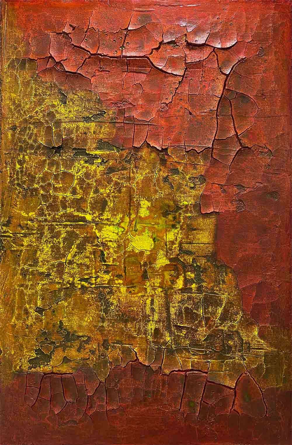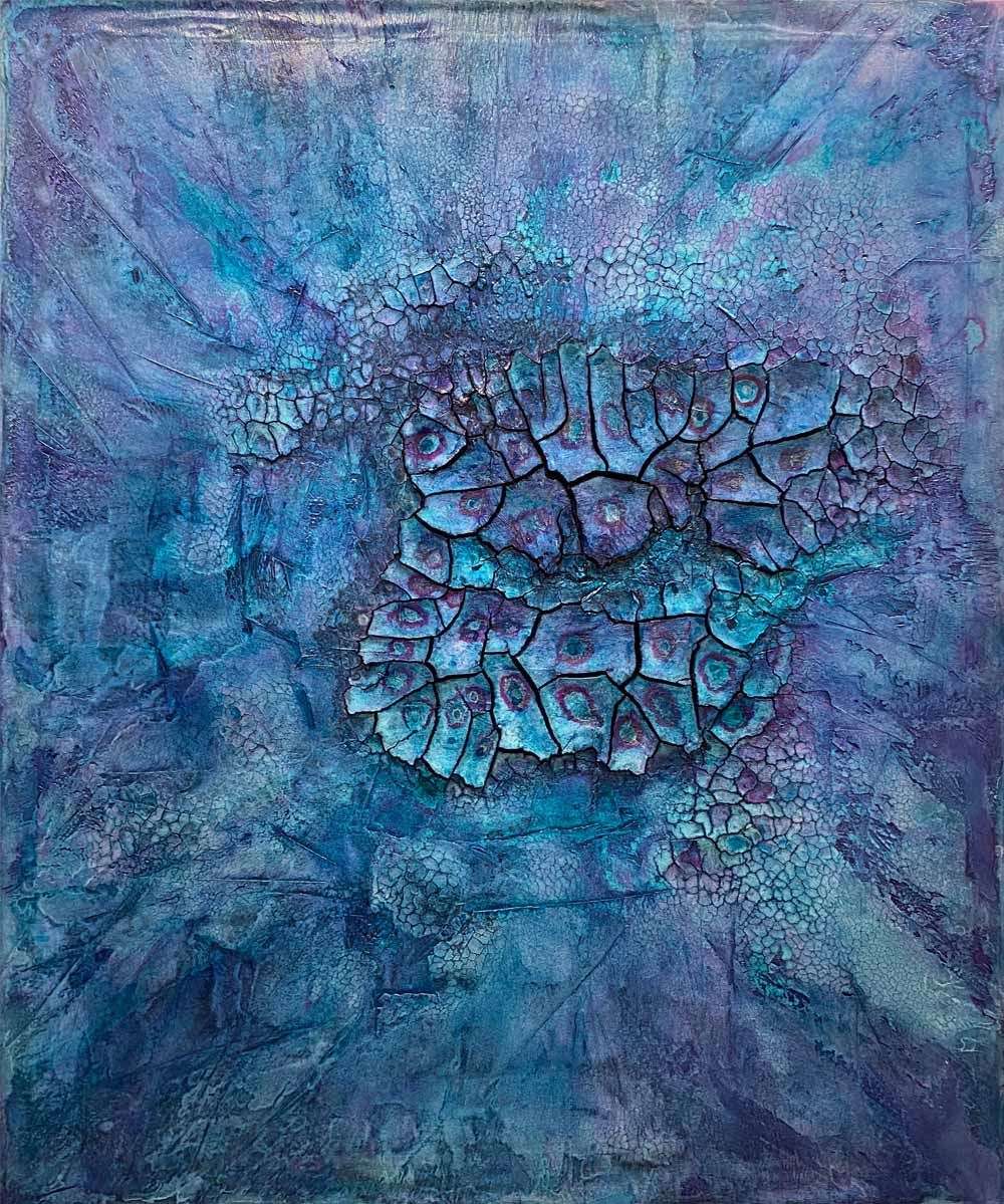Die Serie „Blue Velvet“ ist wie eine leise Ermahnung hinzuschauen, wie fragil unser Planet ist. Welche Spuren hinterlassen wir? Was für Schäden richten wir an, am globalen Gewebe? Der Außenhaut, der Hülle, dem Netz,… ? Wie eine Aufsicht aus dem All, erkennt man vielleicht eine gebrochene Landschaft, tektonisch zerklüftet, mit Spuren von mal oxidierenden Bedingungen, mal reduzierenden. Oxidierendes Eisen, rote Erde, wie Rost über Stahl, oder Eisen, dann grau-weiße Flächen, Häute, aufgerissene Gips- oder Kalkspuren,… Gabriele Utechs Kunst lädt ein Querverbindungen zu erkennen.