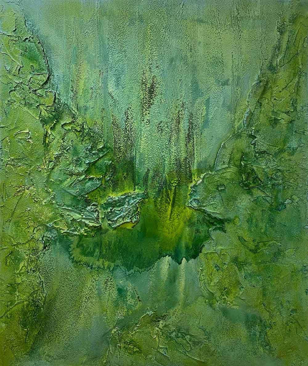 Neue Wege werden beschritten, vielleicht auch alte, auf jeden Fall andere. Das Ergebnis ergibt sich über die Zeit. Strukturen von Trocknung und Austrocknung werden sichtbar. Fließstrukturen bisweilen. Die entstehenden Ansichten regen die Fantasie an. Sie erinnern an GEO-ART. Fotografien von Erdstrukturen, Satellitenbildansichten, je nach Färbung von Wasser, auch Zellstrukturen kann man in die Arbeiten interpretieren.
