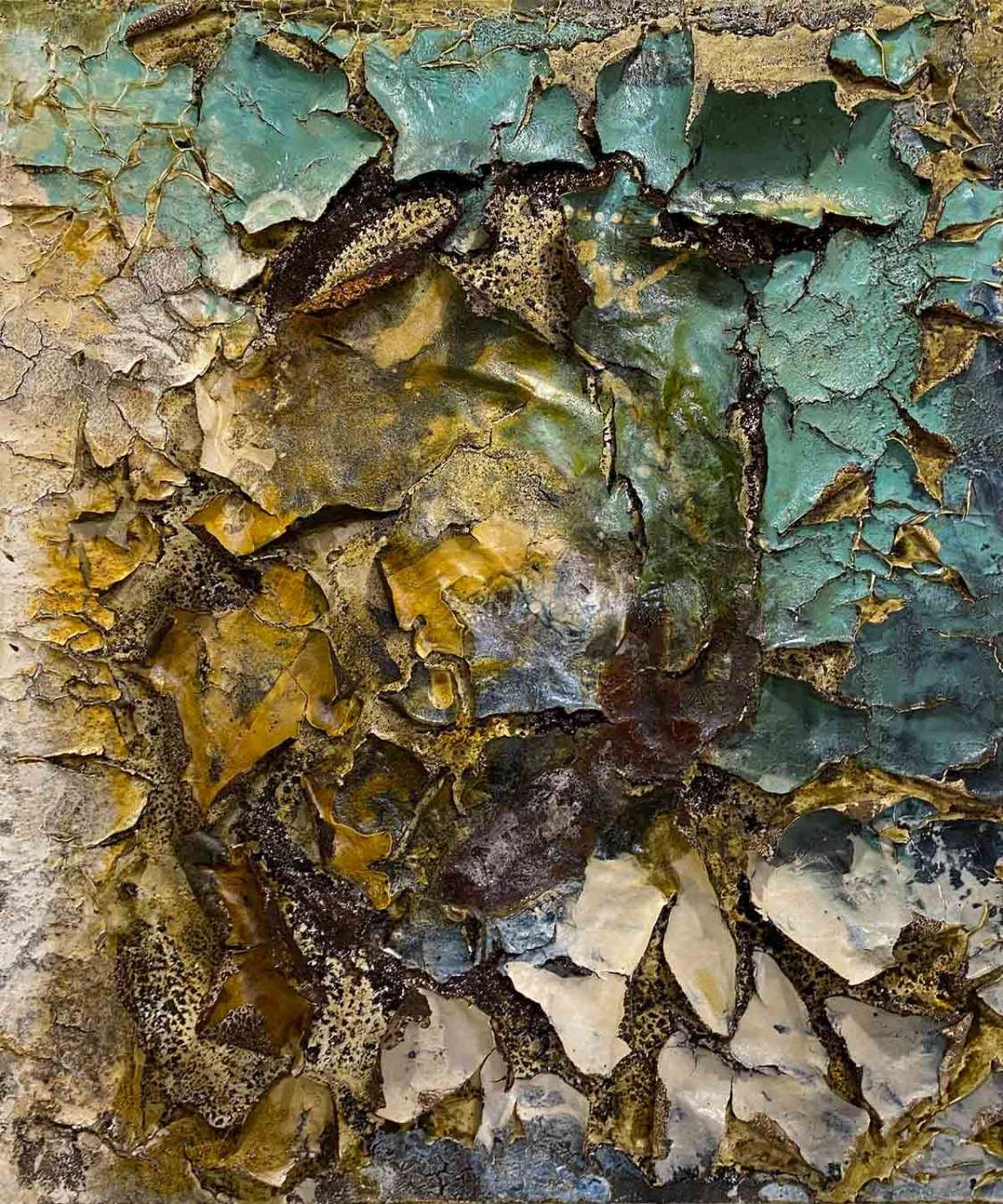 Gesteinsmehle, Sumpfkalk, Pigmente, Bindemittel oder andere Stoffe, sowohl natürlich entstanden, als auch künstlich entwickelt und hergestellt. Gabriele Utech experimentiert mit Aufbringungstechniken, und die abstrakten, sowie expressiven Ergebnisse sind beeindruckende Werke veranschaulichender Material- und Werkstoffkunde. Sogar mit Kaffee wird experimentiert. Auf verschiedensten Untergründen, wie Leinwand, Holz oder Papier, zeigt sich, wie Stoffe mit- und untereinander reagieren. Die entstehenden Werke der Künstlerin laden dazu ein genau hinzuschauen. Wie trocknen die unterschiedlichen Materialien? Was kann man daraus ablesen für erdgebundene Prozesse, Trockenrissbildung, etc. … Man zieht Querverbindungen zu tonhaltigen oder lehmigen Böden und erinnert sich an polygonale Strukturen in verschiedensten geometrischen Ausbildungen. Und Formen.
