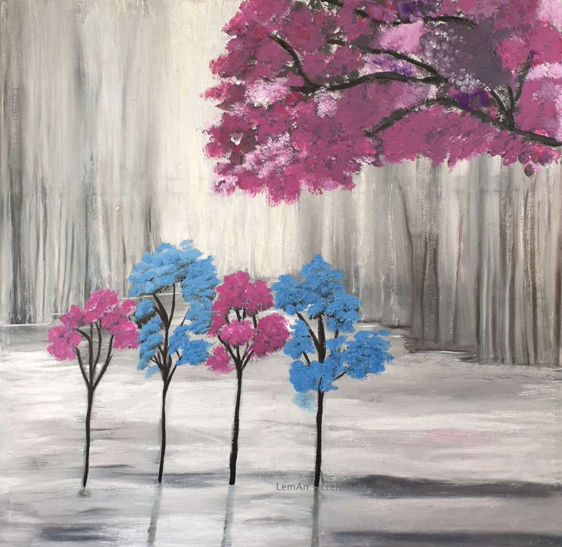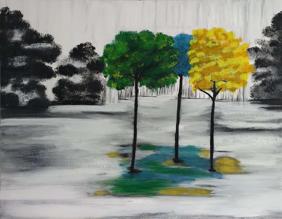 Als Kontrast zum grauen, meist vertikal streifigen Hintergrund, wie vertikales Mikrowellensirren, setzt LemAn Bäume als farbige Akzente.