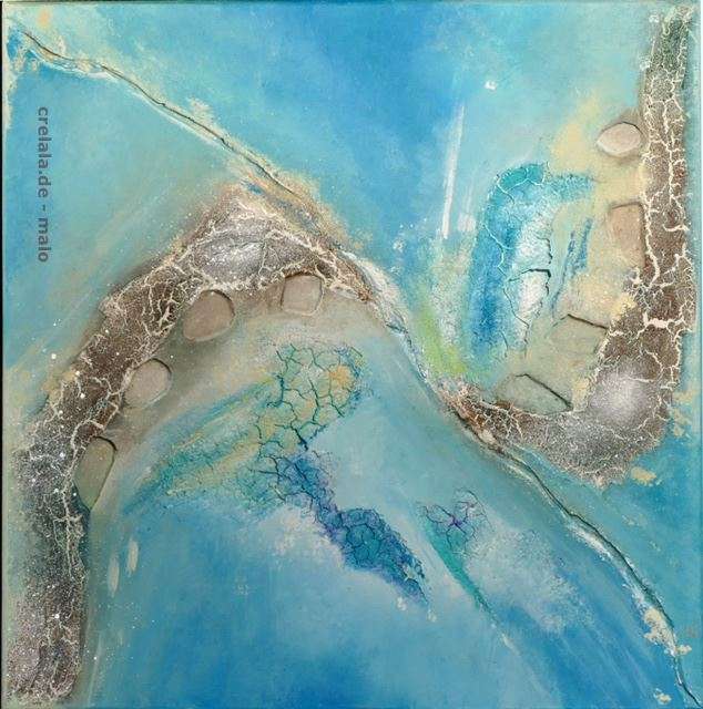 sich wegträumen, sich in fremde Welten flüchten, wer kennt das nicht? Marleen hilft beim Träumen. Dem Moment zu entfliehen und mal einzutauchen in andere Vorstellungswelten. Die Künstlerin liebt das Spielen mit Material und Farbe und das Vermischen verschiedenster Substanzen. Strukturpasten, sehr häufig gold, werden zu Landschaften, zu Zöpfen, zu geologischen Strukturen, zu Traumwelten und Inseln im Meer, gegeneinander verschoben, aneinander entlang driftend, inmitten blauer Lagunen, vielleicht in mystischen Korallenwelten.