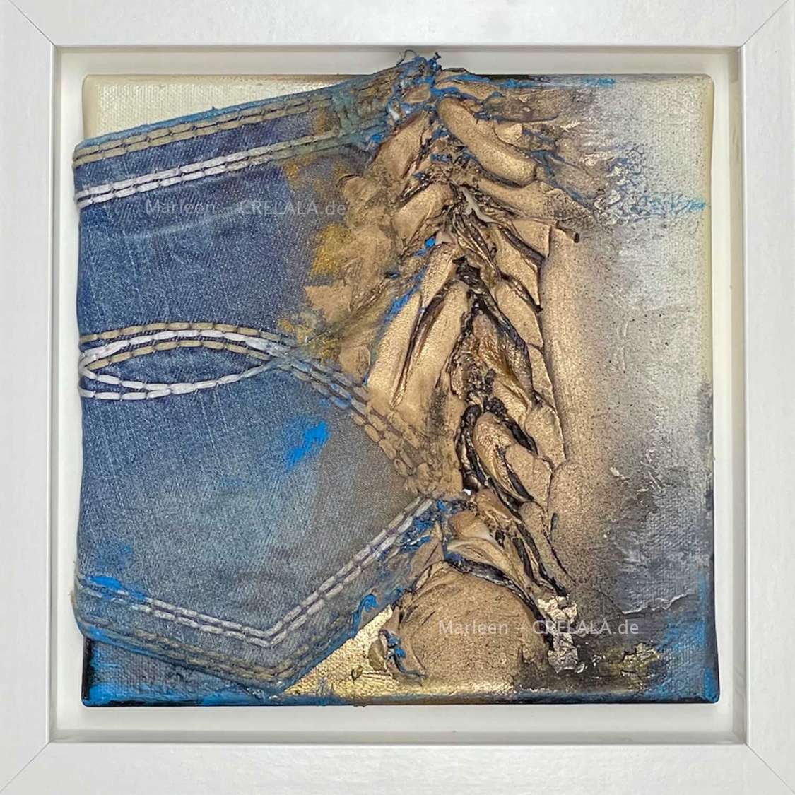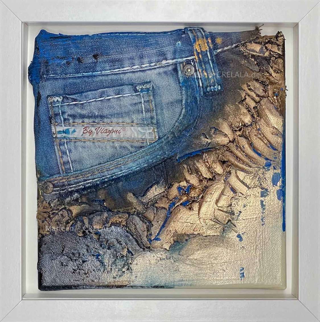 Über hundert Jahre ist der Stoff alt, und wenn nicht mehr zum Kleidungsstück zu gebrauchen, vielleicht wert, ihn in Kunst einzuarbeiten, so dass man den neuen Forderungen einer nachhaltigen Generation nachkommen kann. Wie Vögel die Winde bezwingen, so bezwingt Kunst die Wände, an die sie gehängt wird. Unikate, wie Dekorationsobjekte, Gold für die Wand. - Blue Jeans integriert.