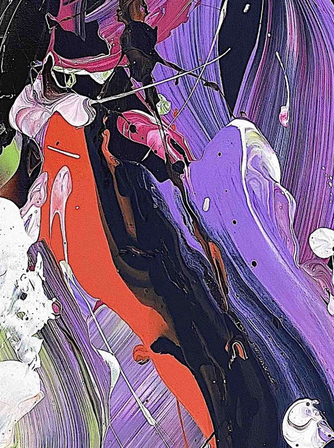 Milanda de Monts POETIC MEMORIES sind hell. - Ihr lyrisch abstrakter Expressionismus setzt goldene Akzente. - Die Farben, noch immer typisch Milanda de Mont, füllen zunehmend den Raum! - In Lila-rosa-schwarz-weiß, bei den Poetic Memories.