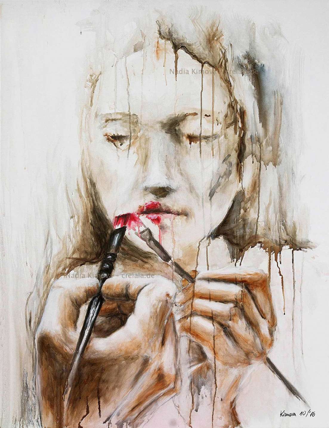 Wir sprechen über die Wirkung des Gesehenen und kommen auf den Punkt, dass früher in den Kopf gespielte Bilder eine Bedeutung haben, dass vielleicht gelesene Bücher, gesehene Filme, Krimis oder Psychothriller bei ihren Bildern so manches Mal zum falschen Schluss führen können. Nadia Kimova spielt bewusst damit den Betrachter nachdenklich zu machen. Ihre Bilder, wie auch Fotografien beweisen die Tiefgründigkeit und Nachdenklichkeit der Künstlerin.